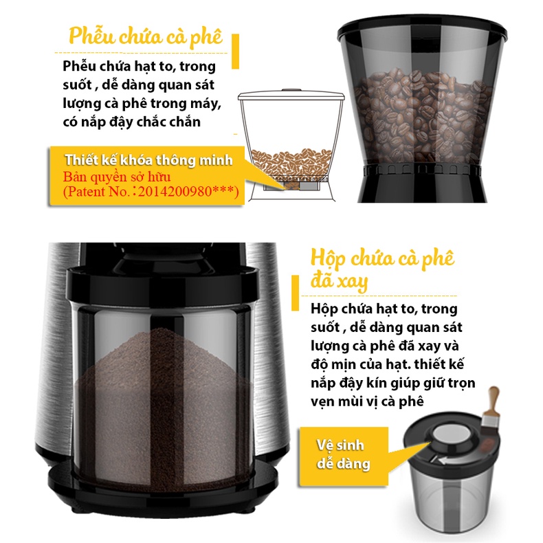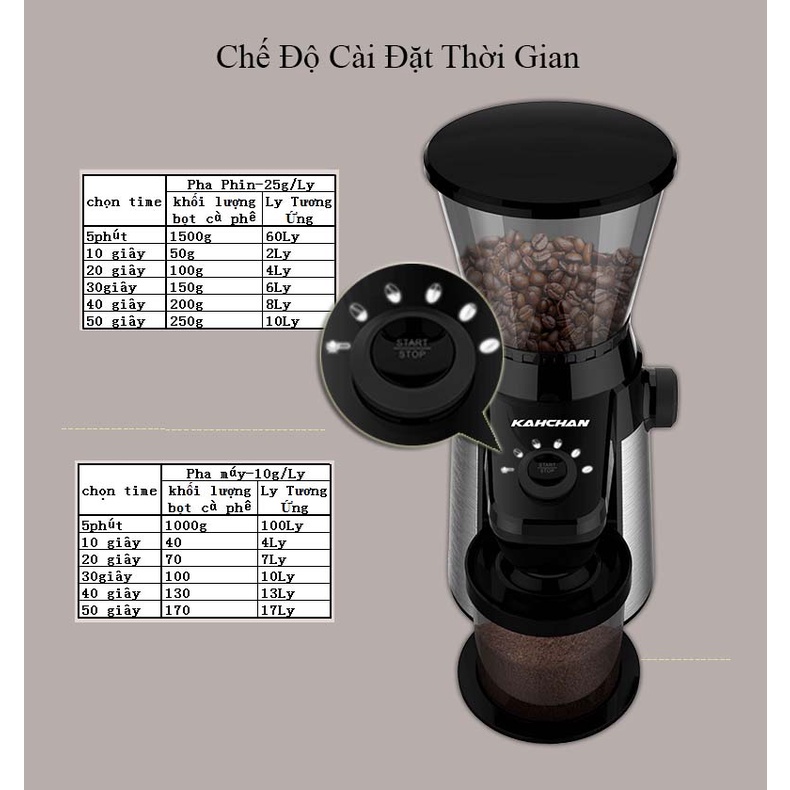 4.Máy xay cafe chuyên nghiệp kahchan có cối xay chứa 400gr hạt cà phê, khóa thông minh,không rơi cà phê khi tháo quặng chứa