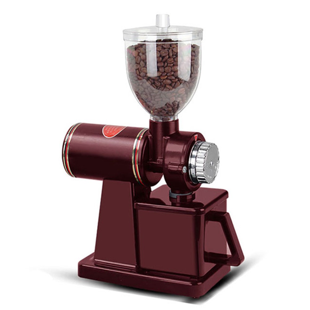 - Máy xay cà phê bằng điện, có đĩa xay bằng gang. Cà phê sau khi được đổ vào phễu nhập liệu, sẽ đi qua bộ lưỡi xay của máy để cà phê được xay mịn, rơi xuống hộp đựng bột phía dưới.