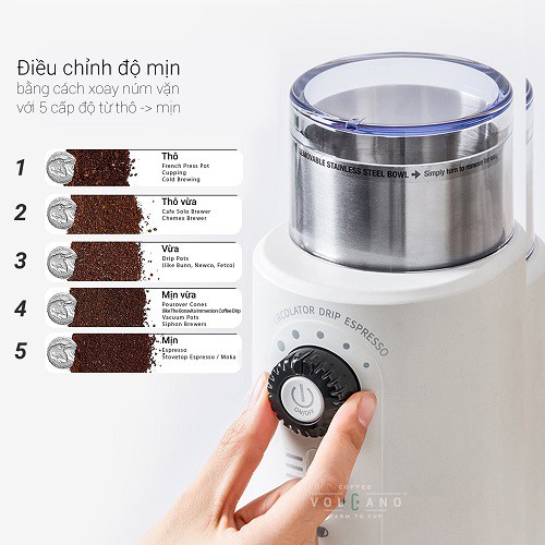 ✅Núm điều chỉnh cỡ xay với 5 cấp độ từ thô->mịn cho phép bạn kiểm soát hoàn toàn độ thô mịn của bột cà phê .Xay cà phê Espresso, Pour Over/V60, hay là French Press vô tư