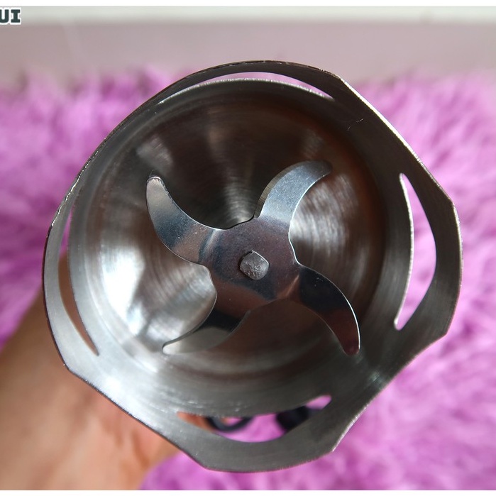 - Máy xay 4 trong 1: Bộ phận lưỡi dao xay 2 lưỡi, bộ phận đánh trứng, ly đi kèm, bộ phận xay tỏi ớt, thịt, cá, cua...