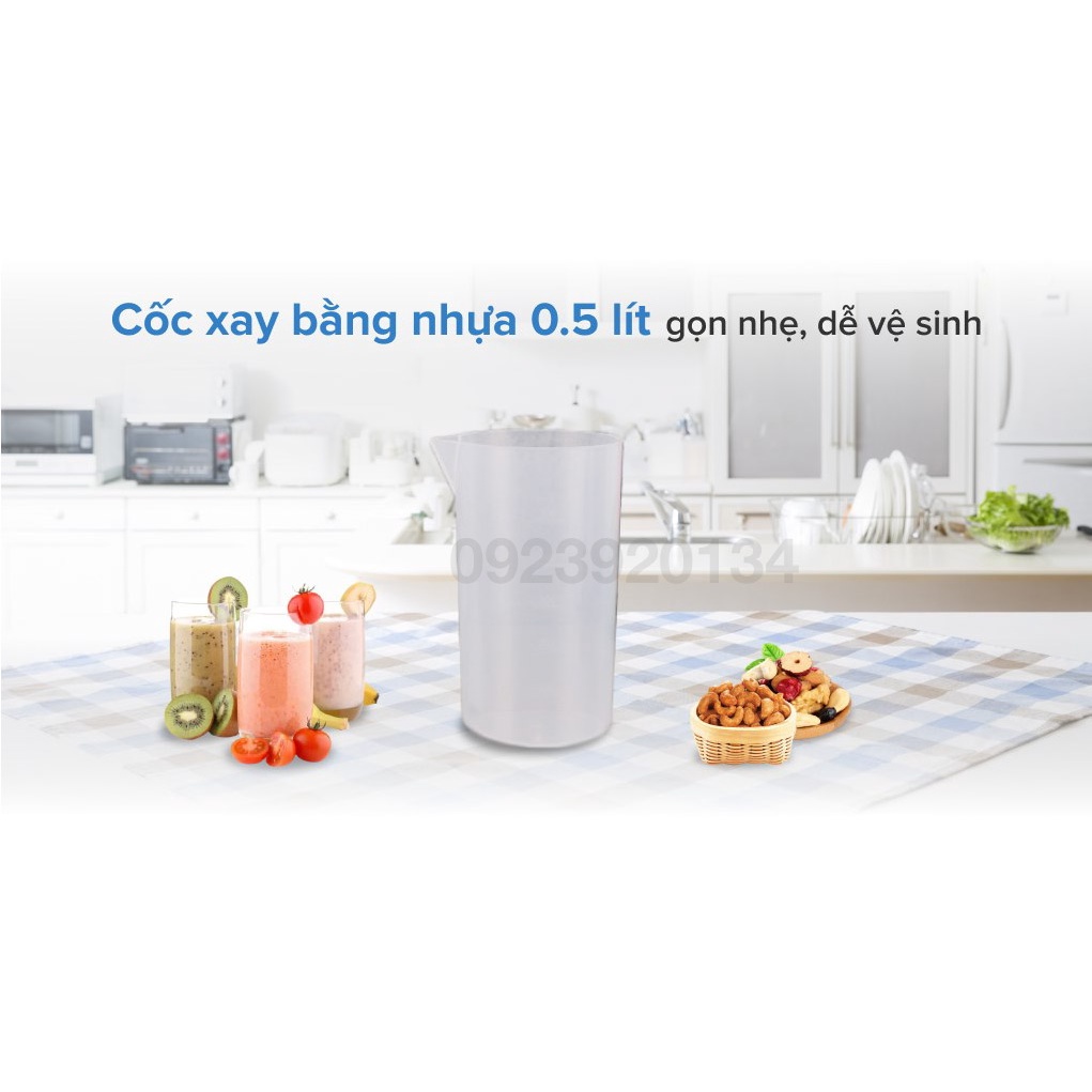 Cốc đựng dung tích sử dụng 500 ml (dung tích trên cối 650 ml) bằng nhựa tốt, kháng vỡ, an toàn cho sức khỏe, dễ chùi rửa