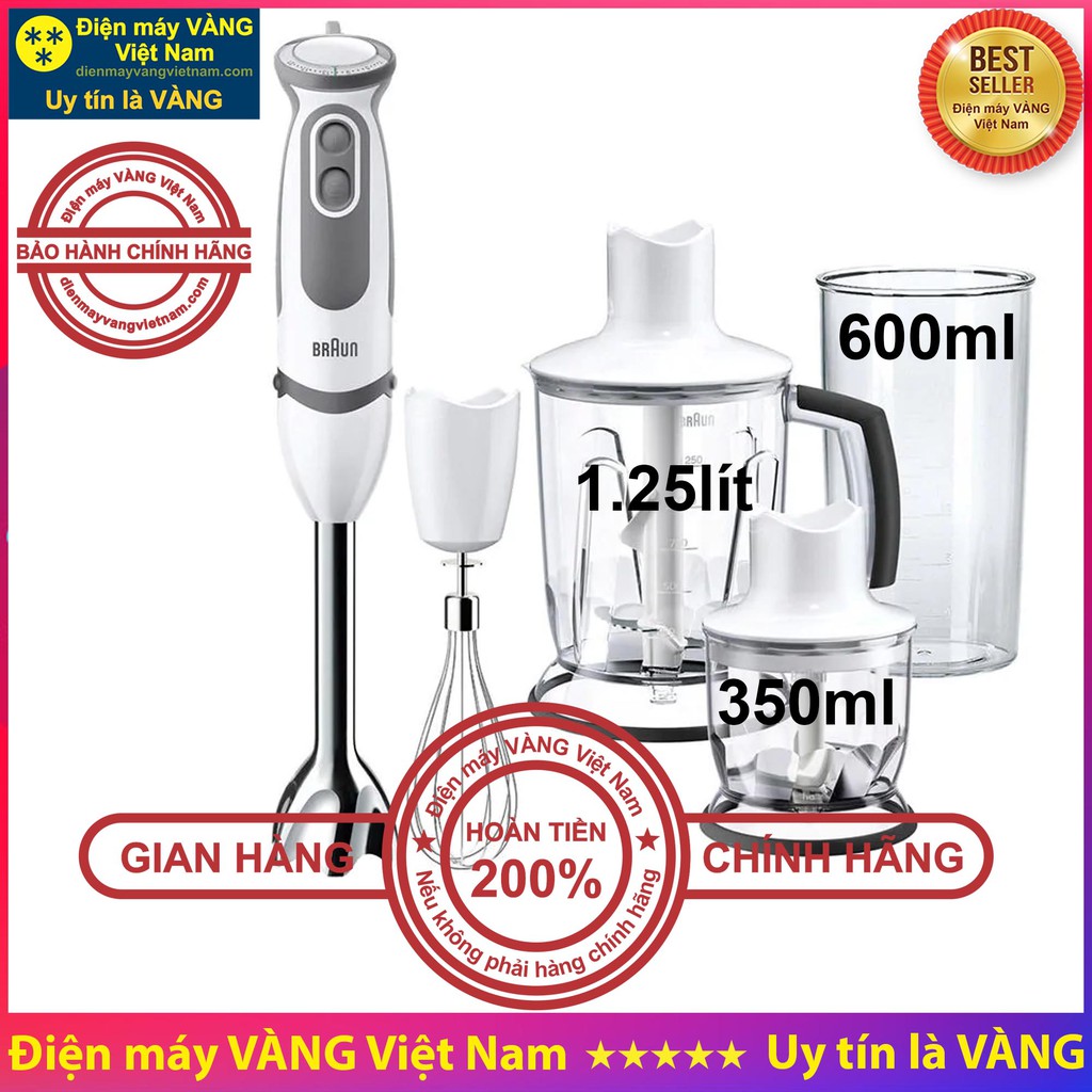 🔵 Với mong muốn có cái nhìn tổng quát về các Model phổ thông của máy xay cầm tay Braun và các linh kiện đi kèm. Điện máy VÀNG Việt Nam tạo ra mã hàng mà ở trong đó có tương đối đầy đủ các thông tin về máy xay Braun để Quý khách có thể so sánh các model trước khi quyết định mua để phù hợp với nhu cầu sử dụng.🔵 Máy xay cầm tay MQ5000 MQ5200 MQ5035 MQ5235 MQ5030 MQ5045 MQ5245 - Phụ kiện máy xay Braun (Hàng chính hãng) là chiếc máy duy nhất bạn cần để thay thế cho một loạt các loại máy phụ giúp việc chế biến thực phẩm như: máy đánh trứng, máy xay sinh tố, máy làm kem, máy xay thịt cá, máy xay cà phê,… Dòng máy xay cầm tay mới được giới thiệu ra thị trường một thời gian ngắn đã được nhiều người ưa thích nhờ những tính năng ưu việt và các tiện ích nổi trội phục vụ việc bếp núc như: Có thể điều chỉnh tốc độ thông minh, khả năng xay rất nhuyễn, đa chức năng, máy cực khỏe và bền, dễ sử dụng.