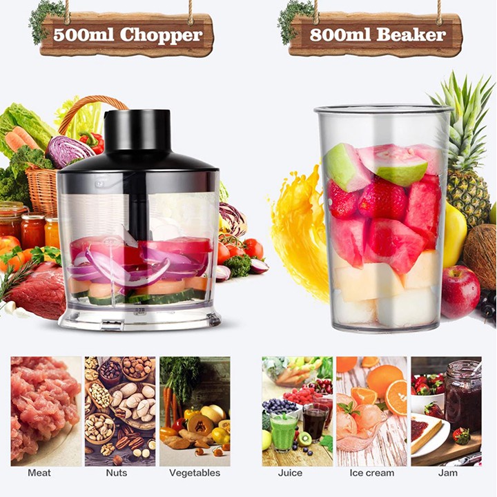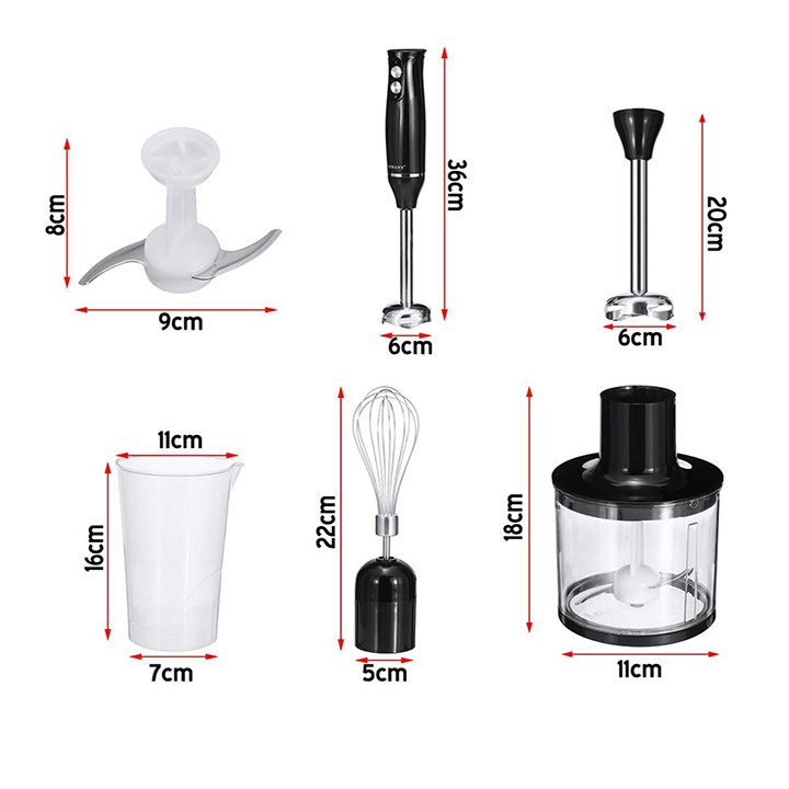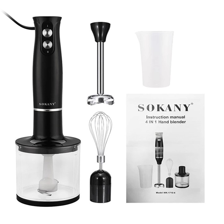 Máy xay sinh tố cầm tay SOKANY - 500W bao gồm cây xay, 1 cây đánh trứng, 1 cối xay thịt và 1 cốc xay tiện lợi, hỗ trợ người dùng có thể chế biến được nhiều thực phẩm đa dạng khác nhau, phục vụ cho cả gia đình những món ăn ngon, phong phú và bổ dưỡng.