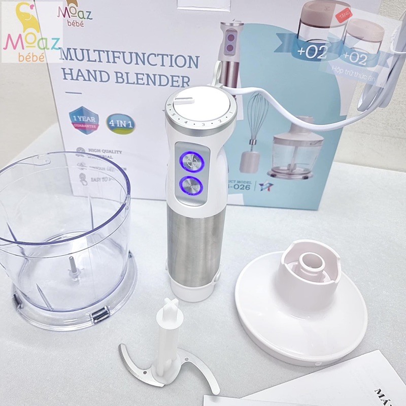 " MÁY XAY CẦM TAY ĐA NĂNG MOAZBEBE MB-026MOAZ BÉBÉ tiếp tục trình làng một trợ thủ đa tiện ích dành cho các mẹ trong quá trình nuôi bé ăn dặm cũng như trong công cuộc nội trợ đảm đang, với 4 chức năng trong 1 bộ sản: Trộn thức ăn, xay thức ăn khô, xay thức ăn ướt, đánh trứng.