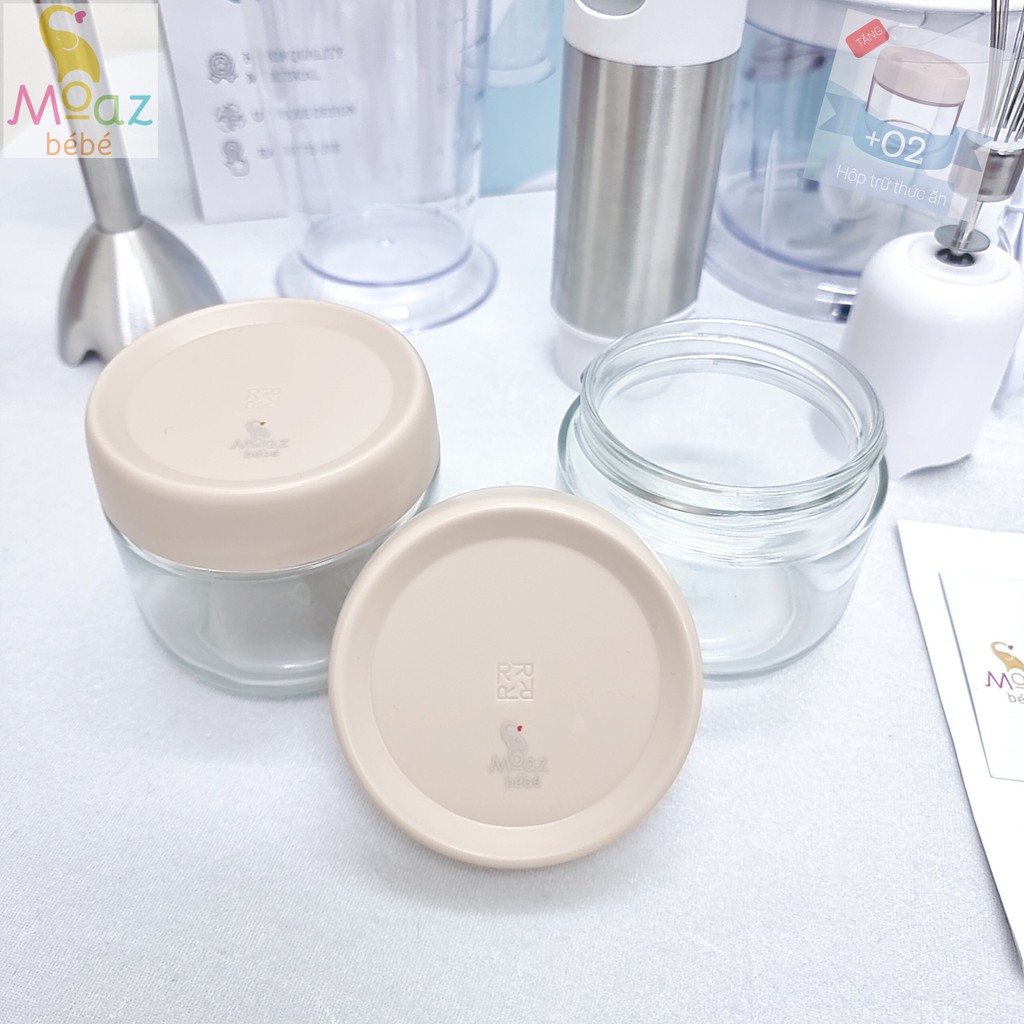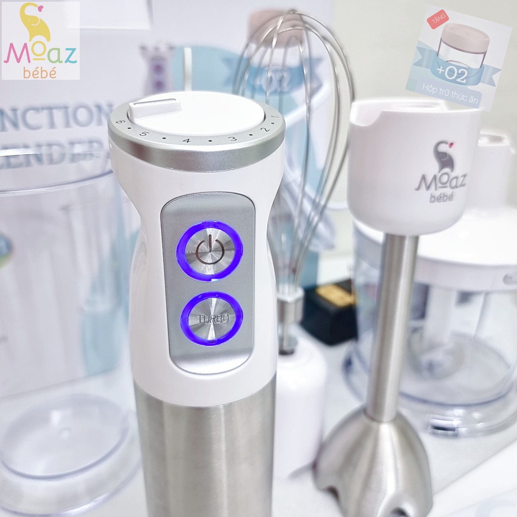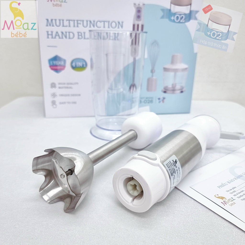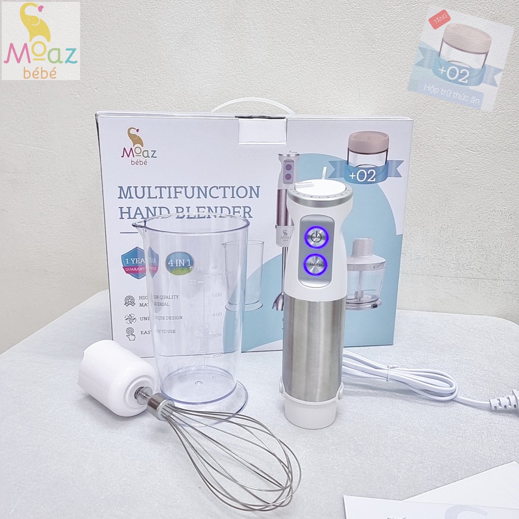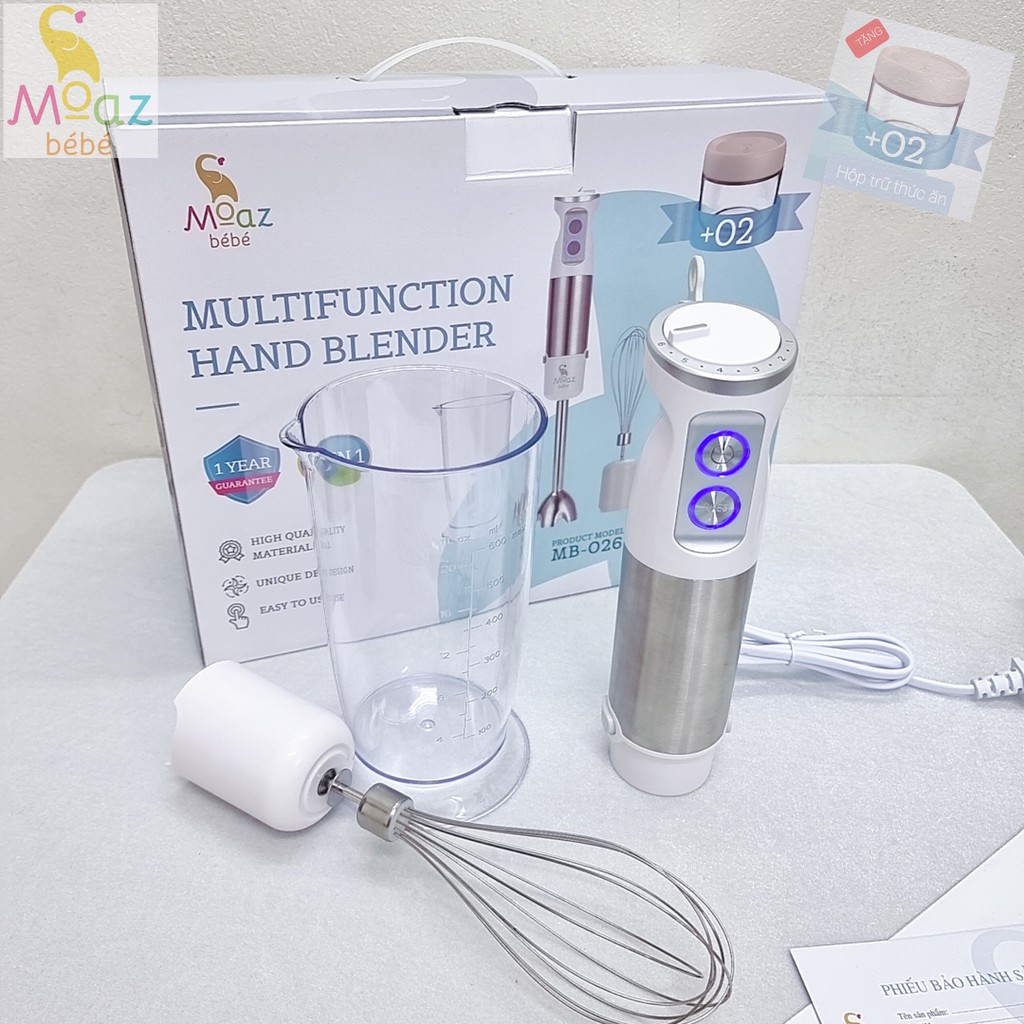 Máy xay đa năng cầm tay Moazbebe mb026 tặng kèm 2 hộp trữ thức ăn, bảo hành chính hãng 12 tháng.+ 1 bộ gồm: 1 thân máy công suất 800W, 1 đầu xay ướt, 1 cốc, 1 cối xay khô kèm lưỡi dao, 1 đầu đánh trứng, + 2 hộp trữ thức ăn 280ml.