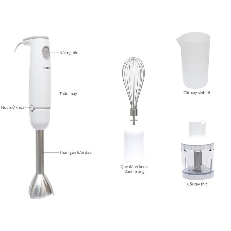 ▶ Sản phẩm gồm một thanh dao xay sinh tố (thực phẩm nước, cháo, soup…), một bộ dụng cụ xay thịt, rau, hạt khô và một dụng cụ đánh trứng kem.