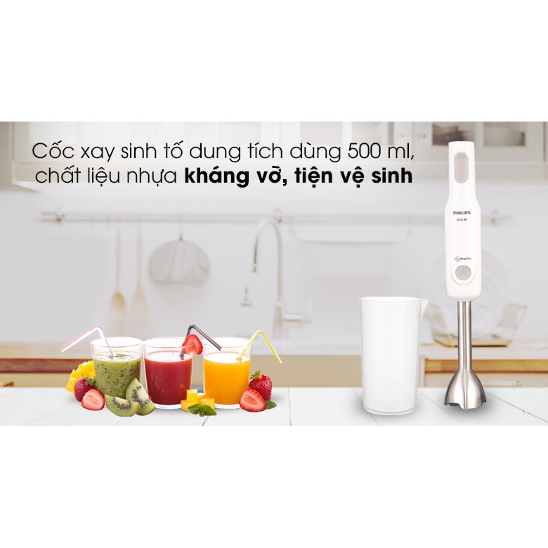 Máy xay sinh tố Philips có cốc xay sinh tố dung tích 650 ml (dùng thực tế 500 ml) bằng nhựa kháng vỡ, an toàn và dễ vệ sinh