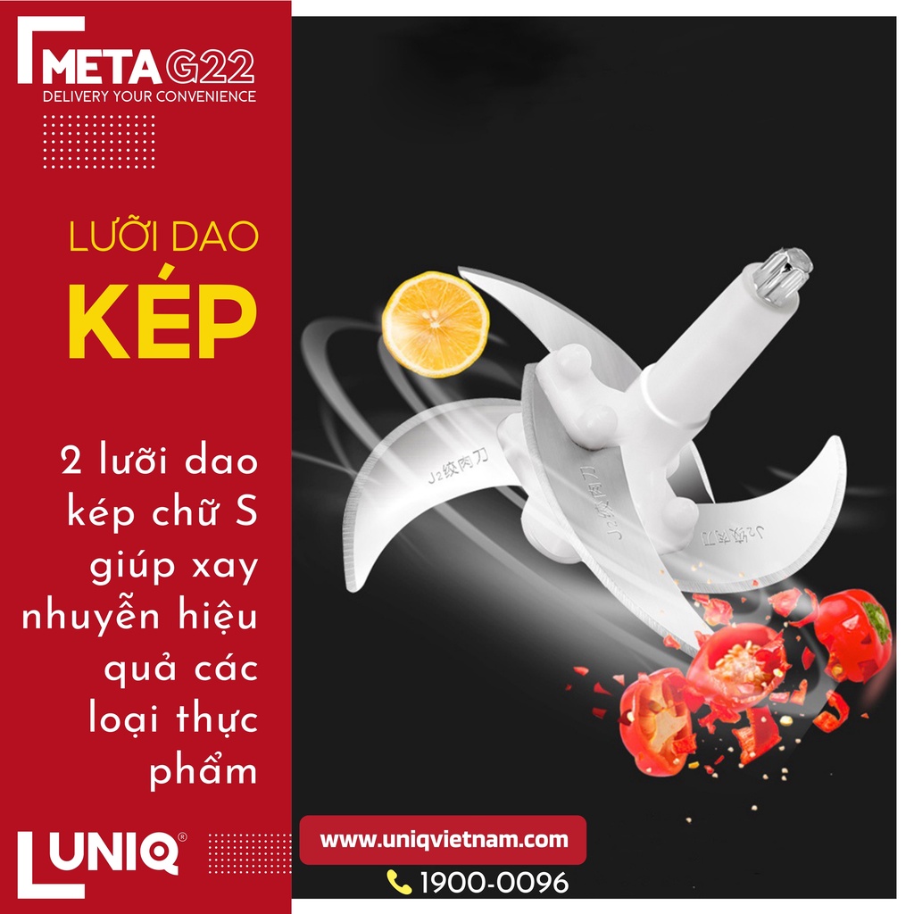 Máy xay thịt đa năng UNIQ Meta G22 chiếc máy xay này có thể xay được đa dạng các loại thực phẩm khác nhau, từ thịt tươi sống cho tới các loại củ, quả mềm, hạt cứng,...Với động cơ trục xoay mang đặc điểm chuyển động nhanh, có công suất lên tới 300W cùng 4 lưỡi dao xay sắc bén, đa tầng, máy xay thịt đa năng UNIQ Meta G22 có 2 chế độ xay, giúp xay nhuyễn các loại thực phẩm một cách dễ dàng. Trong đó:Chế độ xay I phù hợp để xay các loại thực phẩm mềm như: chuối, táo, bí ngô, hành, tỏi, ớt,...