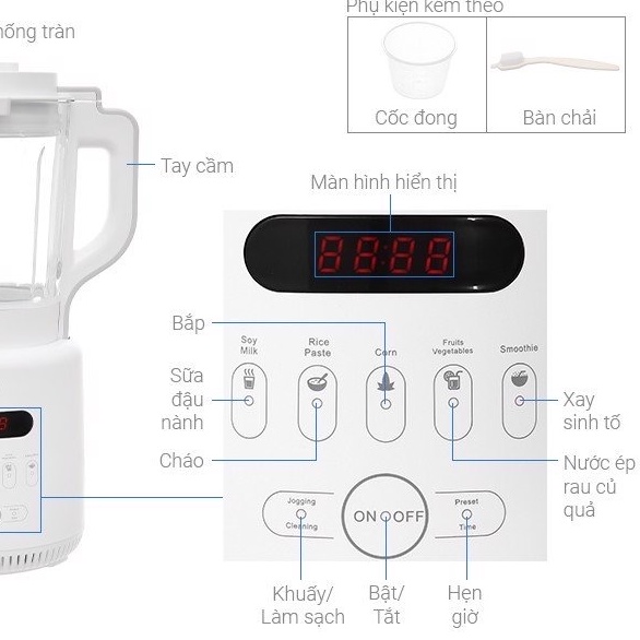 - Menu có sẵn: Xay sữa đậu nành, xay bột, nấu cháo, xay rau quả, nấu súp, hâm hấp giúp linh hoạt tự động chế biến các món ăn, tráng miệng phù hợp với các chế độ nấu.