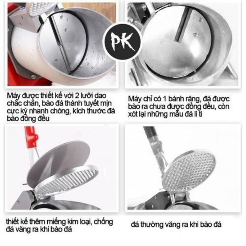 Máy xay đá tuyết áp dụng công nghệ mới, sử dụng nguyên tắc ly tâm trong hoạt động, bề ngoài nhỏ gọn, trọng lượng nhẹ di chuyển nhanh có thể đặt ở bất kỳ vị trí nào. Trong khi hoạt động may bao da tạo ra tiếng ồn thấp, ít ảnh hưởng đến người sử dụng. Có thể vận hành nhanh chóng. Với máy bào đá là trợ thủ đắc lực giúp bạn có món sinh tố và sirô thơm mát lạnh chỉ trong nháy mắt vào những ngày nóng. Có thể bào đá nhanh chóng, gần như ngay lập tức bạn bỏ đá vào là đá bào sẽ xuất hiện ở ngăn đựng của nó. Máy chạy êm ít gây ồn ào không gây khó chịu khi bào. Máy xay đá viên không phụ thuộc vào khối đá cho vào. Đá lớn hay nhỏ đều sẽ được máy bào nhanh chóng. Hướng dẫn vận hành máy bào đá Quy trình vận hành Trong quá trình vận chuyển do một số chi tiết, đầu nối,dây dẫn điện có thể bị lỏng,hở hoặc đứt vì vậy trước khi vận hành cần : 1- Kiểm tra lại dây dẫn 2- Kiểm tra lại công tắc nguồn trên máy 3- Kiểm tra lại toàn bộ máy xem có bị nứt vỡ hay biến dạng Các bước vận hành B1- Cấp nguồn điện cho máy,bật công tắc nguồn B2- Cho đầy đá vào trong khoang tiếp theo đó dùng tay dập để dập tay 1 xuống,đá sau khi được bào sẽ tự rơi xuống khay đựng đá