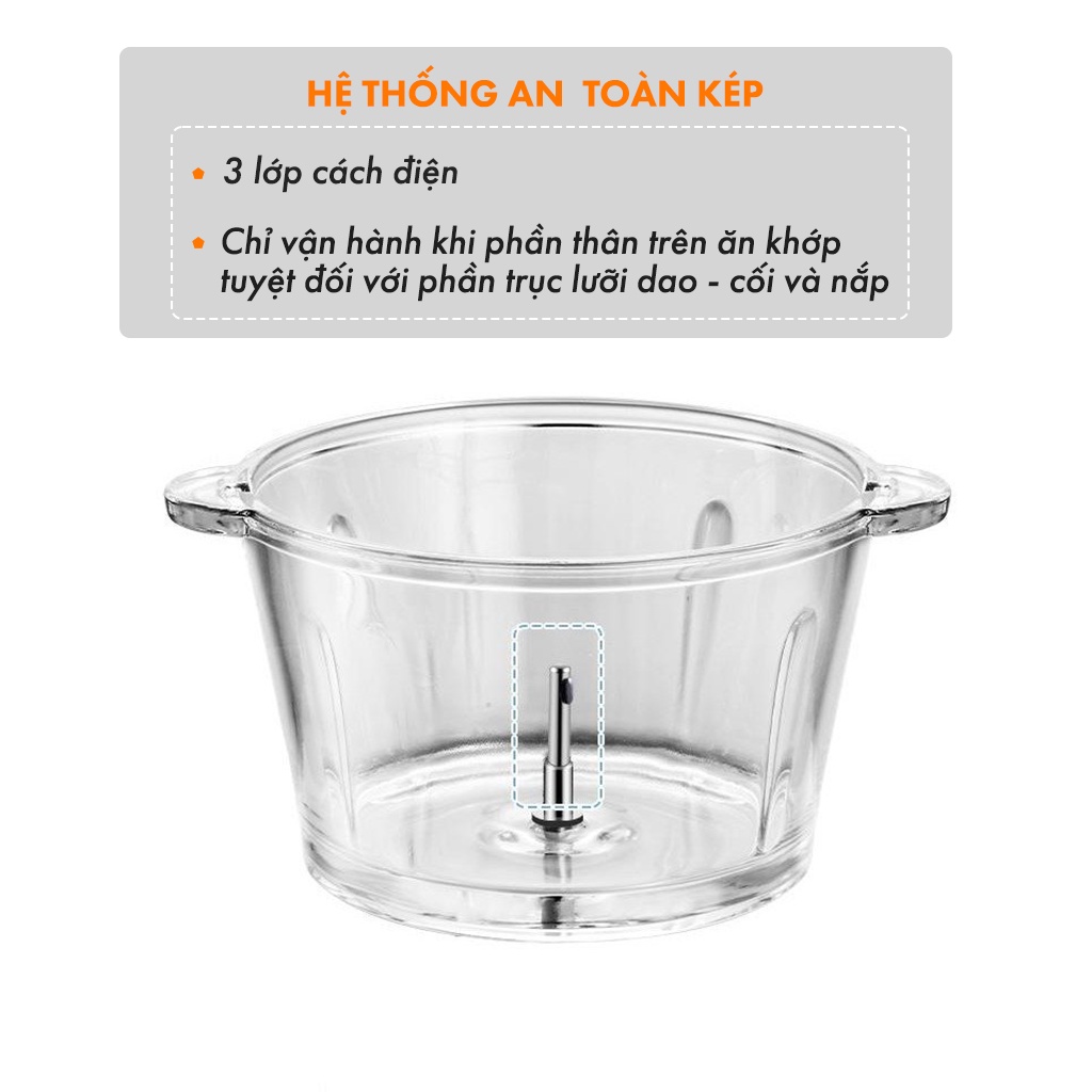 - Thiết kế an toàn, thẫm mỹ, vận hành hiệu quả giúp ích cho công việc nội trợ. Bình bằng thủy tinh dày 1cm, dung tích lớn 2 lít xay được 2kg thịt một lúc, cối thủy tinh của máy xay thịt có độ bền cao và dễ dàng rửa sạch.