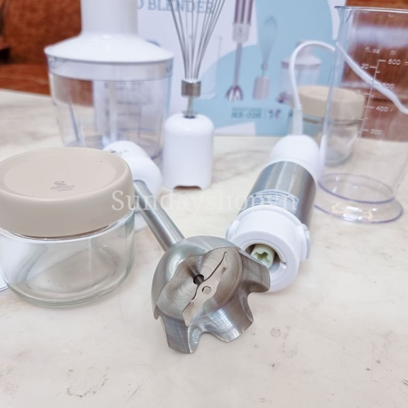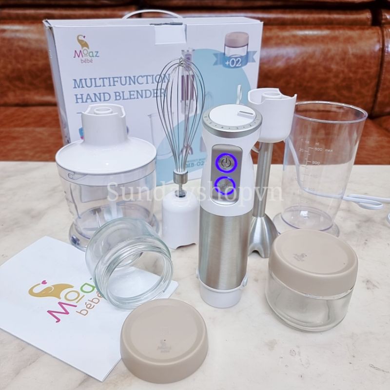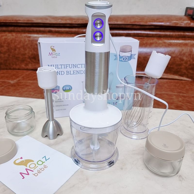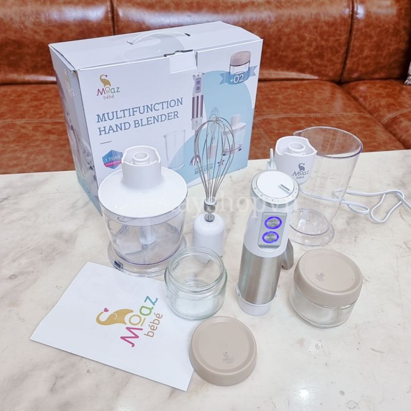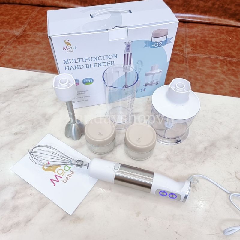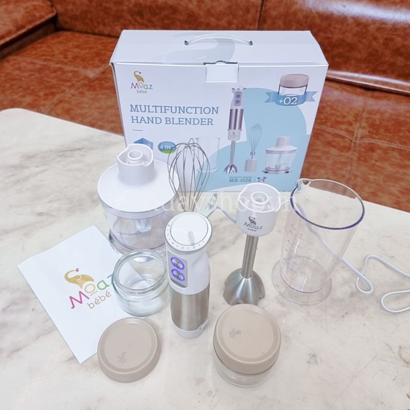 Máy xay đa năng cầm tay Moazbebe mb026 tặng kèm 2 hộp trữ thức ăn, bảo hành chính hãng 12 tháng.+ 1 bộ gồm: 1 thân máy công suất 800W, 1 đầu xay ướt, 1 cốc, 1 cối xay khô kèm lưỡi dao, 1 đầu đánh trứng, + 2 hộp trữ thức ăn 280ml.
