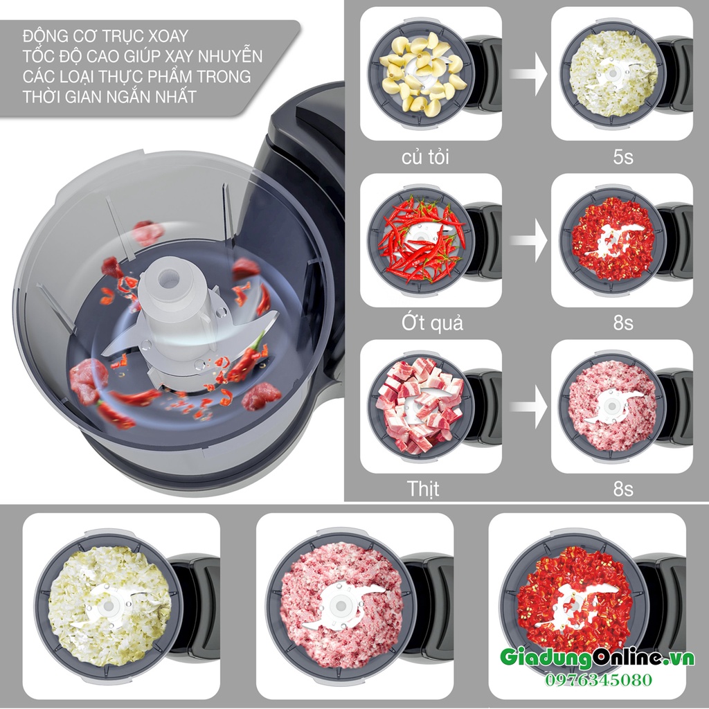 - Xay thịt, Xay rau củ quả, hoa quả, gừng, tỏi, ớt,..