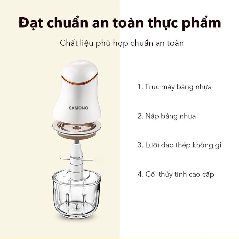 Máy xay SAMONO có công suất 200W, dễ dàng xay nhuyễn thực phẩm trong 10 giây. Trục xoay được thiết kế chuyên dụng, lưỡi dao thép không gỉ, cối thủy tinh cao cấp chịu nhiệt, thiết kế tinh giản, tháo ráp tiện lợi, điều khiển nhấn nhả, dễ vận hành vô cùng.