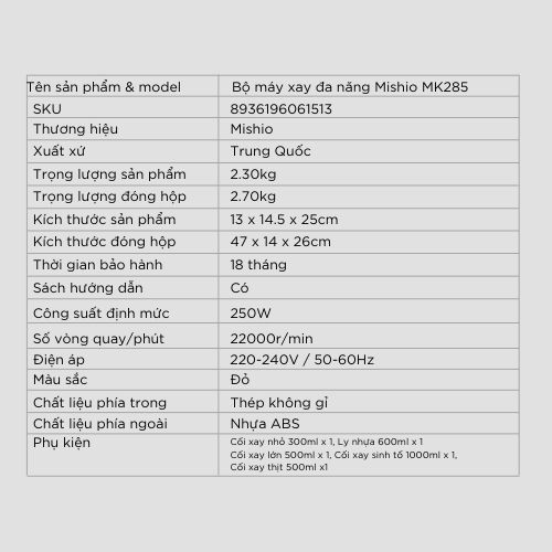 Thiết Bị Điện Gia Dụng > Đồ gia dụng nhà bếp > Máy chế biến thực phẩm & Xay thịt || [Mã ELMALL10 giảm 10% đơn 500K] Máy xay đa năng nhiều cối Mishio MK285Còn hàng