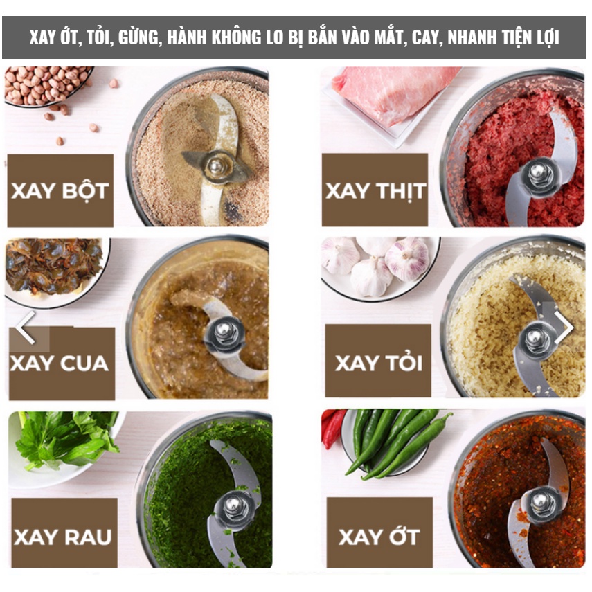 - Gồm 3 phần chính, 1 motor với 2 cấp độ xay, 1 cối chứa thịt xay bằng nhựa, 2 lưỡi dao tác động kép.