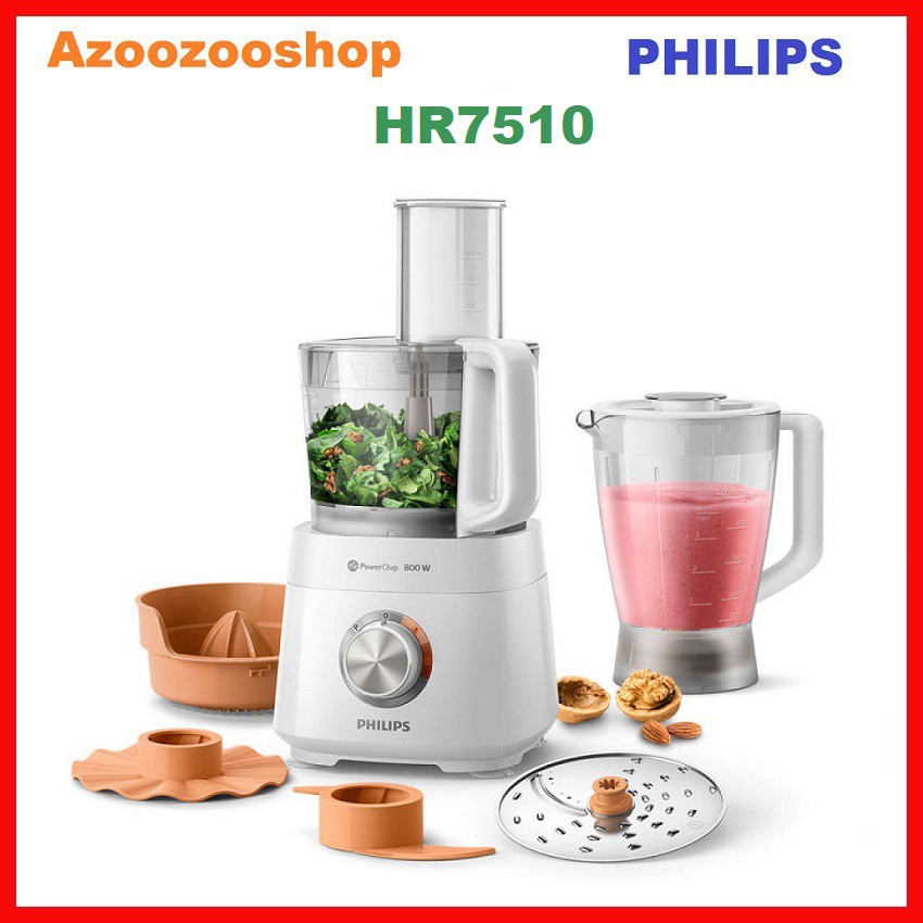 Máy xay đa năng Philips HR7510Công nghệ PowerChop là sự kết hợp của hình dạng lưới cắt, góc cắt và tô bên trong, mang đến kết quả cắt vượt trội đối với cả nguyên liệu cứng và mềm. Nó cũng lý tưởng để làm các món tán nhuyễn và trộn bột làm bánh,Tiết kiệm thời gian, bạn không cần cắt nhỏ trước nguyên liệu vì đã có ống tiếp nguyên liệu lớn.Lắp đặt dễ dàng và nhanh chóng mọi bộ phận.Tất cả các phụ kiện đều có thể rửa ở ngăn trên của máy rửa chén, giúp làm sạch dễ dàng.Cối xay chống vỡ 1,5 lít với dung tích hoạt động 1 lít có thể xay được tới 5 ly sinh tố trái cây cùng một lúcĐộng cơ mạnh mẽ có thể dễ dàng xay đủ mọi nguyên liệu từ bột bánh mì cho đến rau củ cứng, phô mai và sô cô la. Ngoài ra, máy cũng có thể bào và băm thực phẩm dễ dàng.Với hơn 29 chức năng, bạn có thể chế biến vô số loại thực phẩm: thức ăn mặn, bánh mì, nước sốt, nước ép và nhiều hơn nữa. Sử dụng kèm các phụ kiện đa năng và chất lượng cao như lưỡi cắt hình chữ S khi cắt, băm và xay nguyên liệu hoặc lưỡi cắt dạng đĩa 2 trong 1 khi chỉ lát mỏng và cắt nhỏ để chế biến bất cứ món ăn nào