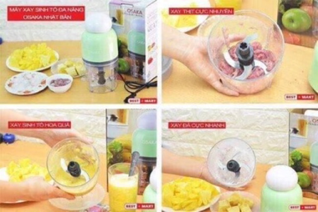 Giới thiệu sản phẩm Máy xay sinh tố hoa quả thịt xay đá 2 lưỡi OSAKAMáy xay sinh tố, hoa quả, thịt, xay đá 2 lưỡi OSAKA là sản phẩm mới được ra đời năm 2017. Máy có thiết kế mới, nhỏ gọn và thời trang giúp người sử dụng dễ dàng mang đi lại, vệ sinh. Đồng thời máy được trang bị 2 lưỡi dao xay đồng thời với công suất 350W có thể xoay được đa số các loại hoa quả và thịt, thậm chí xay được rất tốt các loại hạt và xay được cả đá. Máy còn có thiết kế đơn giản chỉ cần ấn phần nắp xuống là xay, vừa an toàn vừa tiện dụng. Bạn sẽ có một ly hoa quả xay sinh tố cùng với đá mát lành vào những ngày hè nóng bức.