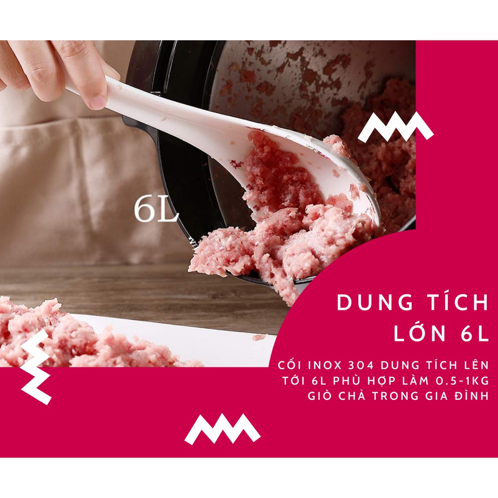 - Cối lớn 6 lít cho phép xay cùng lúc 1.75 kg thịt.
