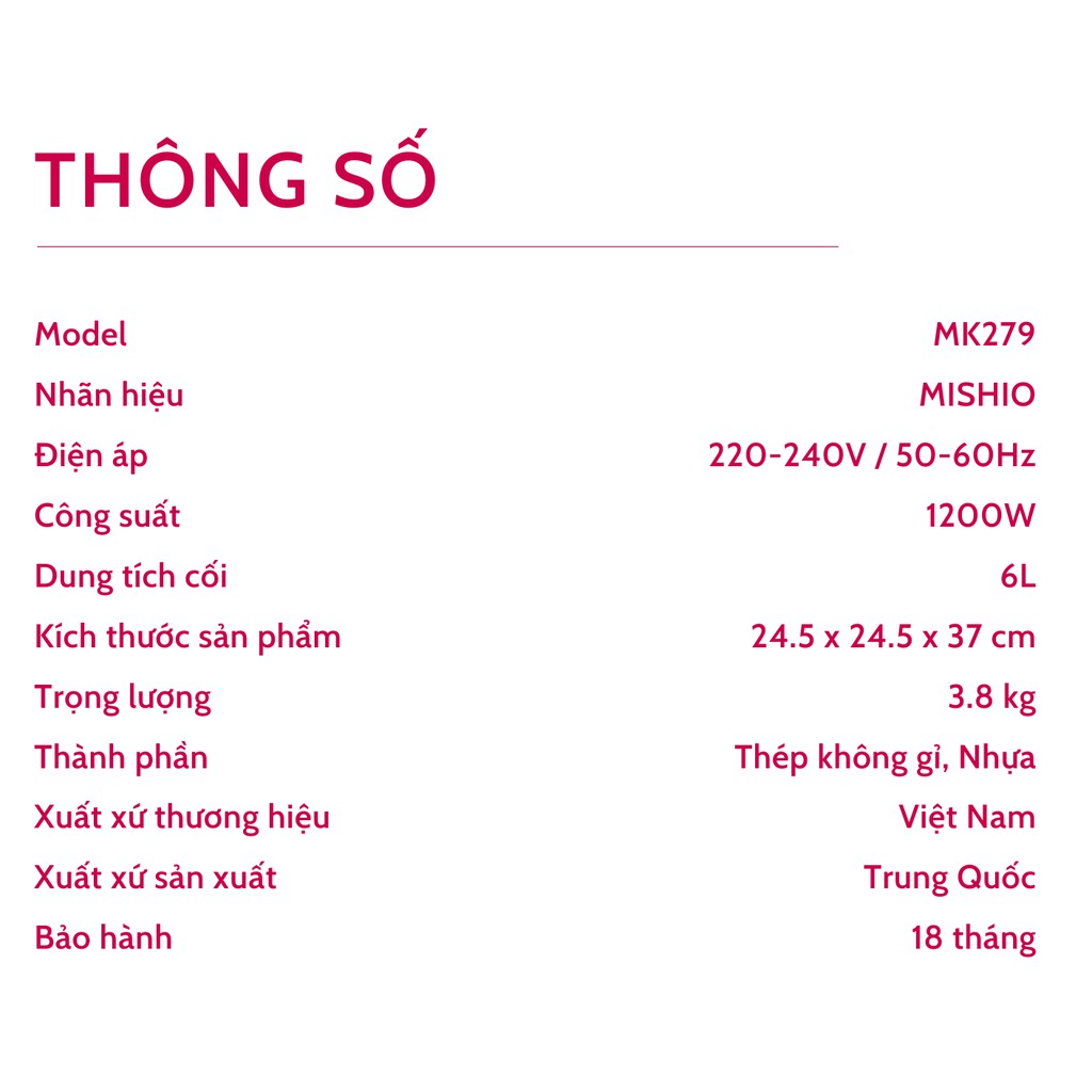 Thông số kỹ thuật Máy xay thịt Mishio MK-279