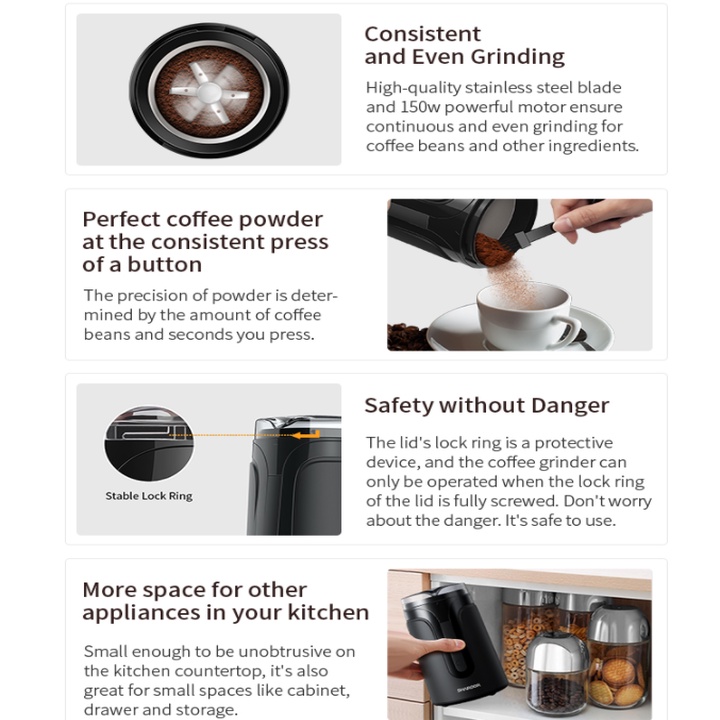 Máy xay hạt cà phê và các loại hạt ngũ cốc Shardor CG515B Công suất: 150W - HÀNG CHÍNH HÃNGChất liệu bền đẹp