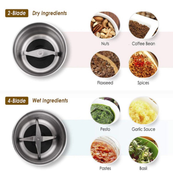 - Máy tích hợp hai cối xay khác nhau. Cối 2 lưỡi xay hạt cà phê đỗ xanh, đỗ tương, hạt tiêu... Với khối lượng 80g/ lần xay giúp bạn có thể xay nhiều loại hạt khác nhau để phục vụ cho nhu cầu sử dụng của gia đình và giúp cho thực đơn món ăn của gia đình bạn ngày càng được nâng cao. Cối 4 lưỡi xay hành, tỏi và các loại rau củ khác...