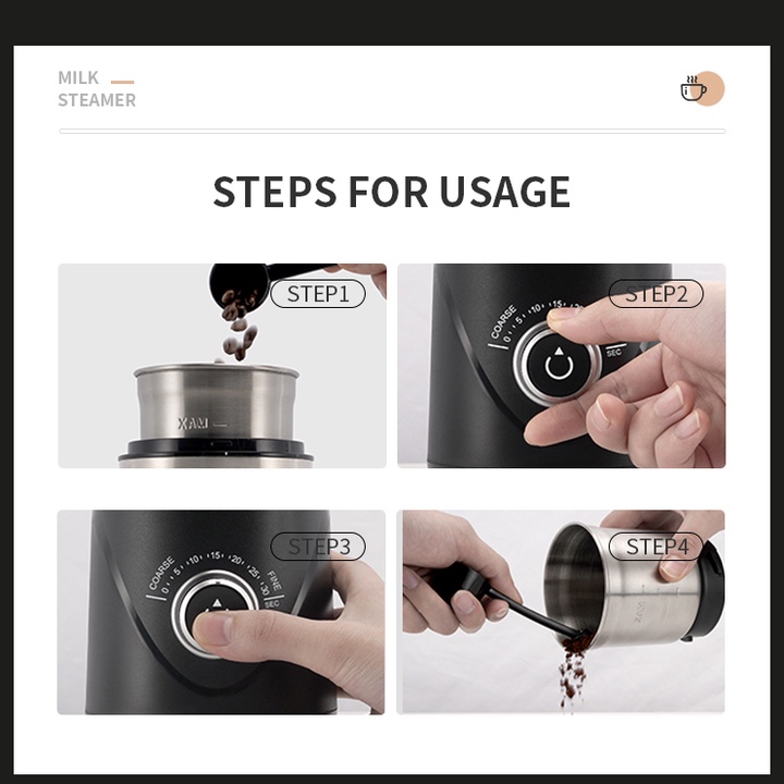- Máy xay đa năng không chỉ hạt cà phê mà còn xay được hạt tiêu, quế, ớt khô, đậu nành, đậu lành, gạo, đường pha lê...