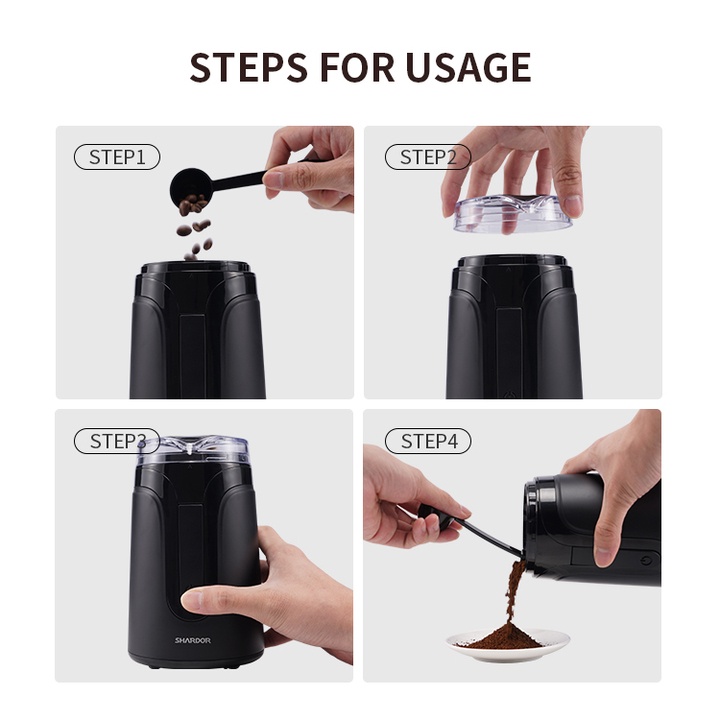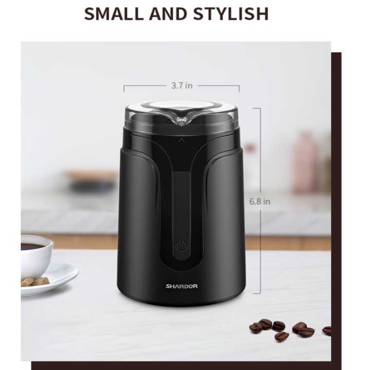 - Máy xay cà phê Shardor CG515B có vỏ bọc nhựa ABS cao cấp, được thiết kế hiện đại, nhỏ gọn và dễ dàng sử dụng, có lưỡi dao được làm bằng thép không gỉ cao cấp cùng động cơ 150W mạnh mẽ, giúp bạn xay mịn hạt cà phê hay các loại hạt ngũ cốc một cách nhanh chóng mà vẫn đảm bảo giữ được hương vị và chất lượng của thực phẩm.