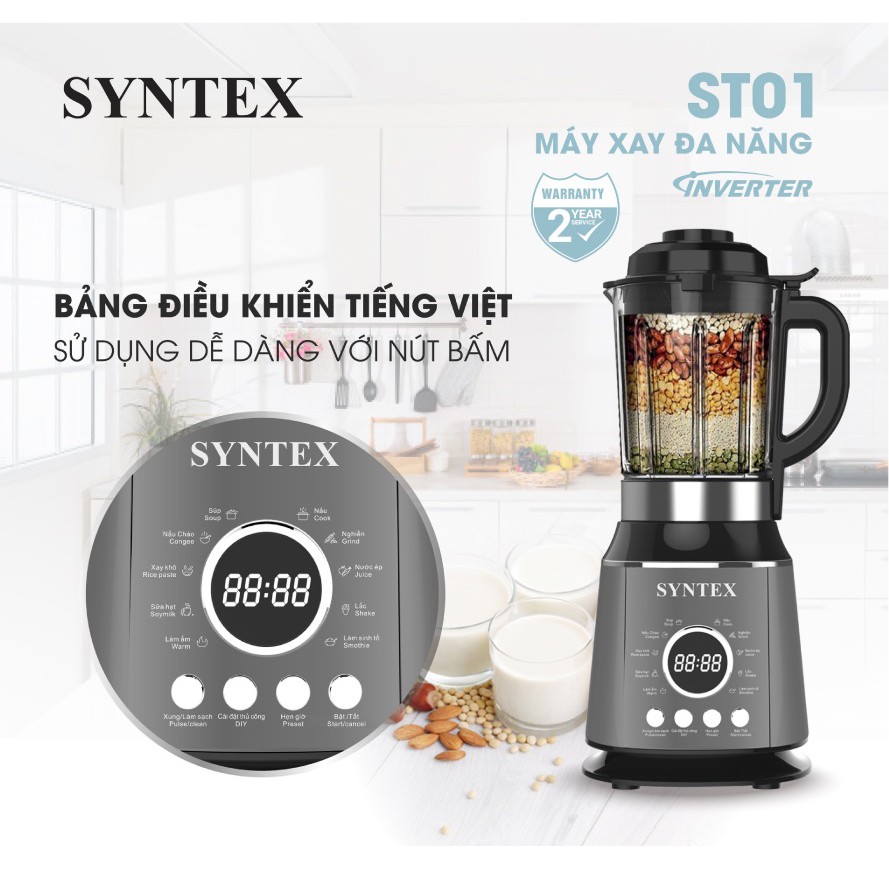 Máy xay nấu đa năng Syntex ST01Máy xay nấu đa năng Syntex ST01 là thiết bị gia dụng hiện đang ưa chuộng nhất hiện nay nhờ thiết kế bắt mắt, công suất hoạt động mạnh mẽ mang đến những ly sữa hạt thơm ngon, tốt cho sức khỏe. Máy Syntex ST01 có 10 chế độ nấu phong phú đáp ứng nhu cầu sử dụng đa dạng từ người tiêu dùng.