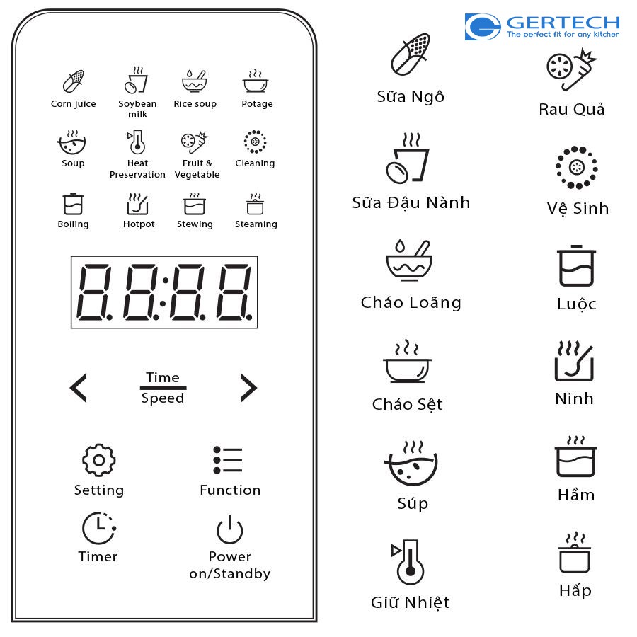Máy xay nấu độ ồn thấp kết hợp nồi nấu GERTECH GT-006 được thiết lập tới 12 chương trình. Trong đó, 08 chức năng tương thích Cối xay là: Sữa ngô, Sữa đậu nành, Cháo loãng, Cháo nhuyễn, Súp, Giữ nhiệt, Rau củ, Vệ sinh và 04 chức năng tương thích Nồi nấu là: Luộc, Ninh, Hầm, Hấp.