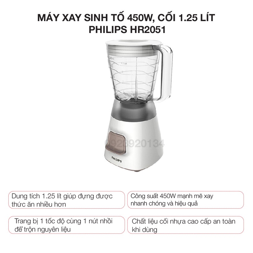 Thiết Bị Điện Gia Dụng > Đồ gia dụng nhà bếp > Máy ép, Xay sinh tố & Máy làm sữa đậu nành || [Mã 273ELHA100K0 hoàn 7% đơn 500K] Máy xay sinh tố 450w, cối 1.25 lít Philips HR2051Còn hàng