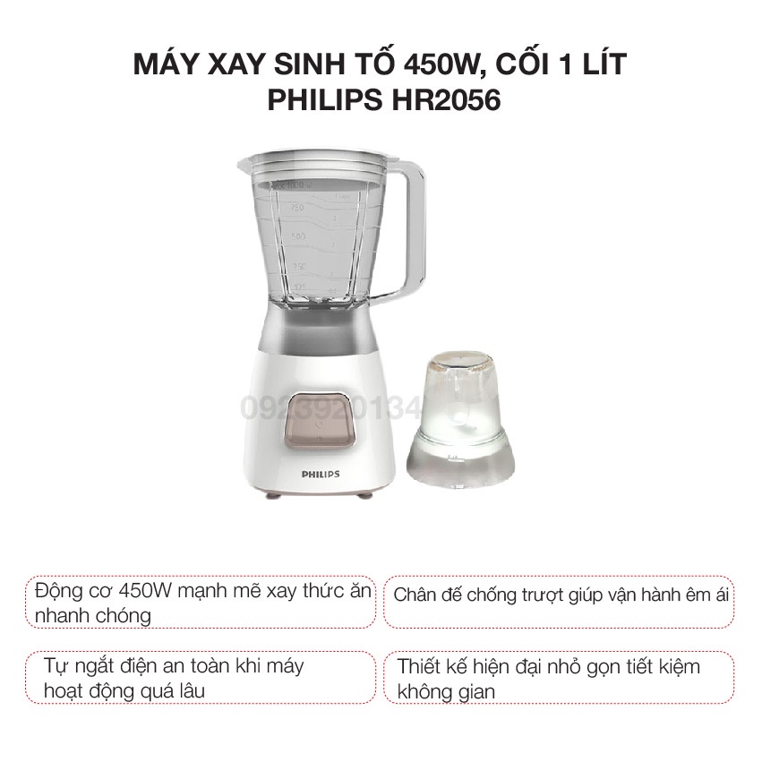 Giới thiệu [Mã ELHA22 giảm 5% đơn 300K] Máy xay sinh tố 450w, cối 1 lít Philips HR2056