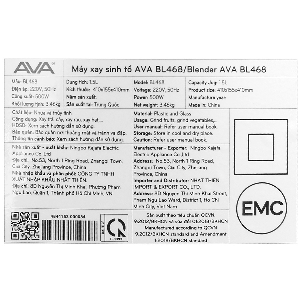 Thiết Bị Điện Gia Dụng > Đồ gia dụng nhà bếp > Máy ép, Xay sinh tố & Máy làm sữa đậu nành || [Mã ELMALL150 giảm 8% đơn 500K] Máy xay sinh tố AVA BL468 1.5 lít 500W xay thịt, hạt, sinh tố - Chính hãng BH 12 thángCòn hàng
