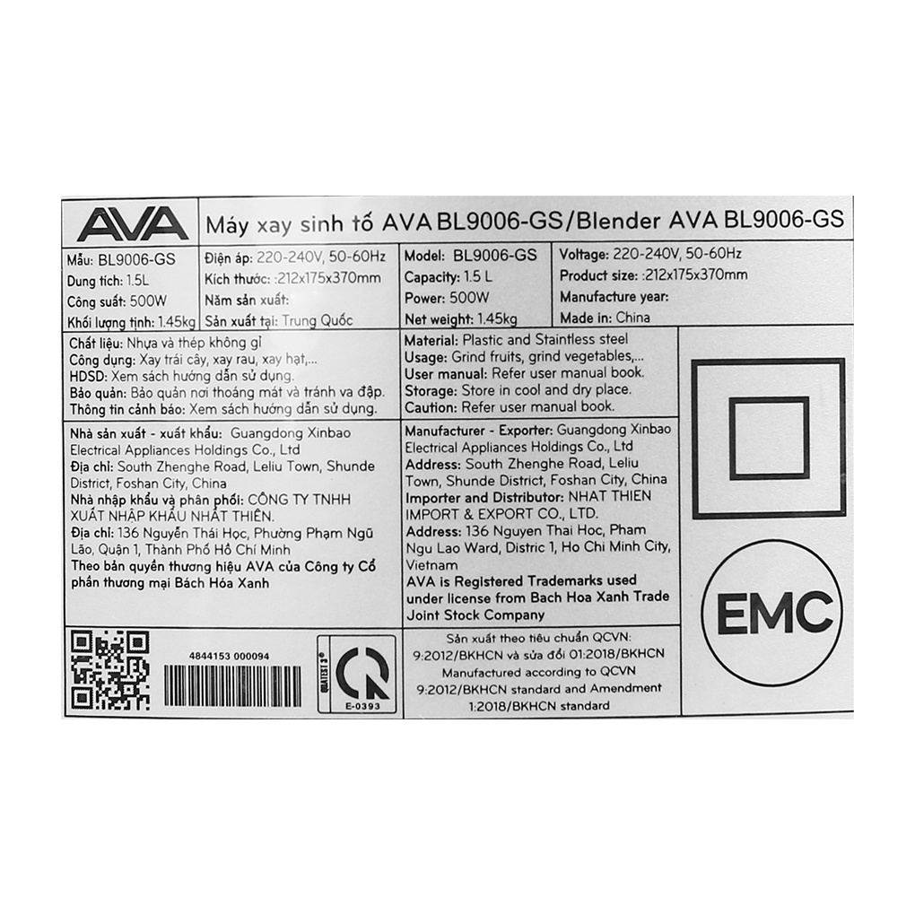 Máy xay sinh tối AVA BL9006-GS nhỏ gọn, dung tích vừa 1.5L, trang bị lưỡi dao sắc bén không gỉ an toàn cho sức khỏe, thiết bị tiện ích phù hợp cho gia đình.