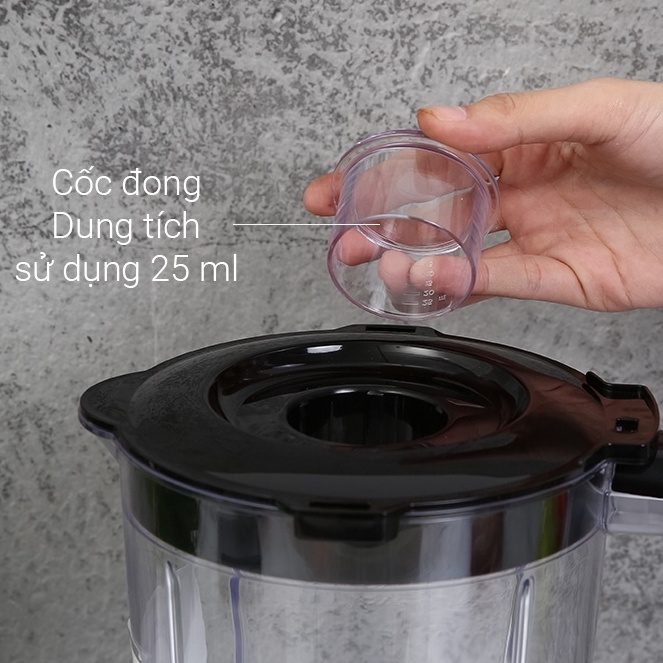 ● Cối nhựa kháng vỡ, bền bỉ với cối lớn dung tích 1.5 lít đựng được nhiều thực phẩm cho một lần xay, dễ vệ sinh