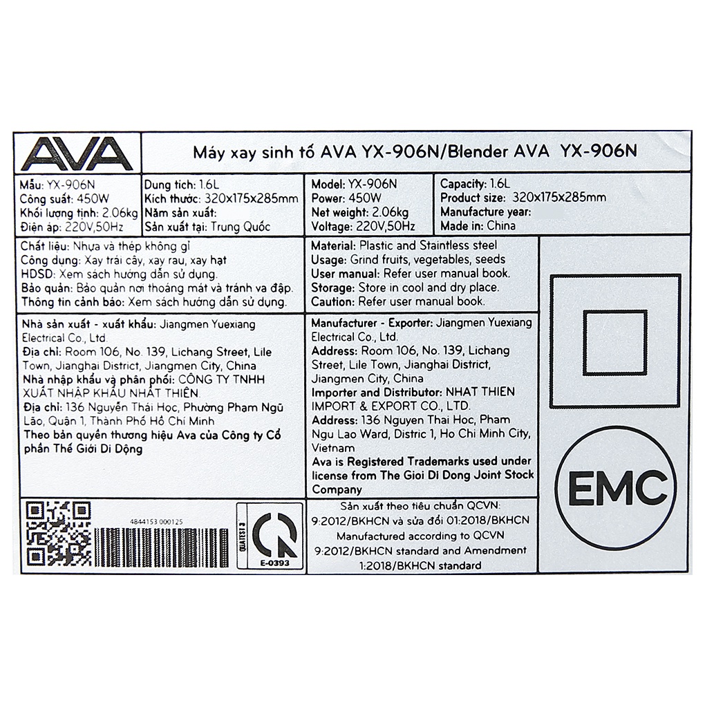 Máy xay sinh tố AVA YX-906N 1.6 lít 450W xay đá, thịt, hạt, sinh tố, gia vị - Chính hãng BH 12 tháng