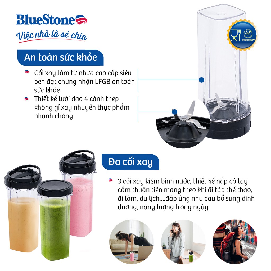 Đặc biệt, máy xay sinh tố BlueStone BLB-5310 được trang bị 3 cối xay bằng nhựa cao cấp đạt chứng nhận LFGB, an toàn sức khỏe, thiết kế gọn, nhẹ, tiện lợi, kiêm luôn bình nước dung tích 600 ml đáp ứng đầy đủ nhu cầu sử dụng sinh tố cho những bạn mang đi làm, tập thể thao, tập gym, thường xuyên di chuyển,....