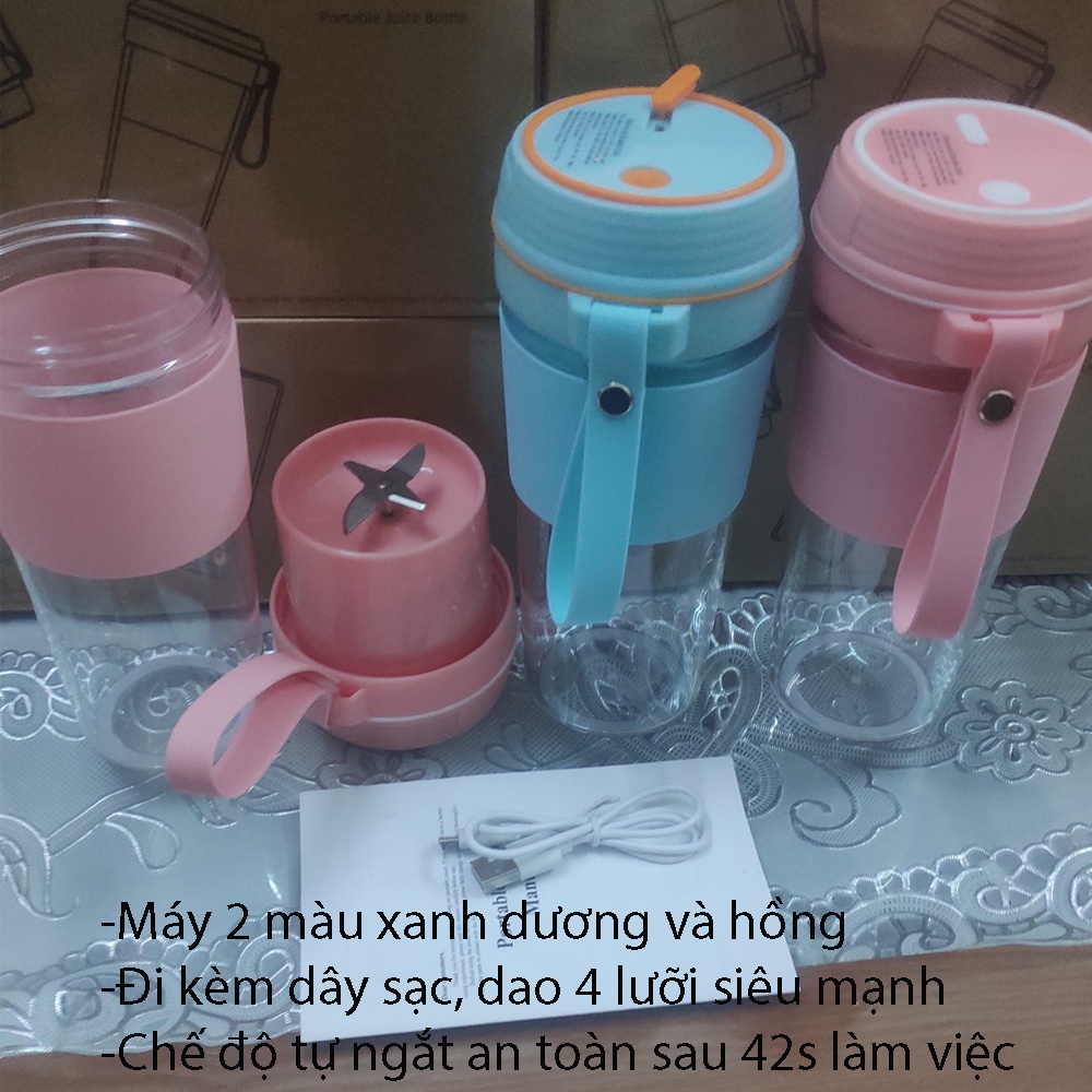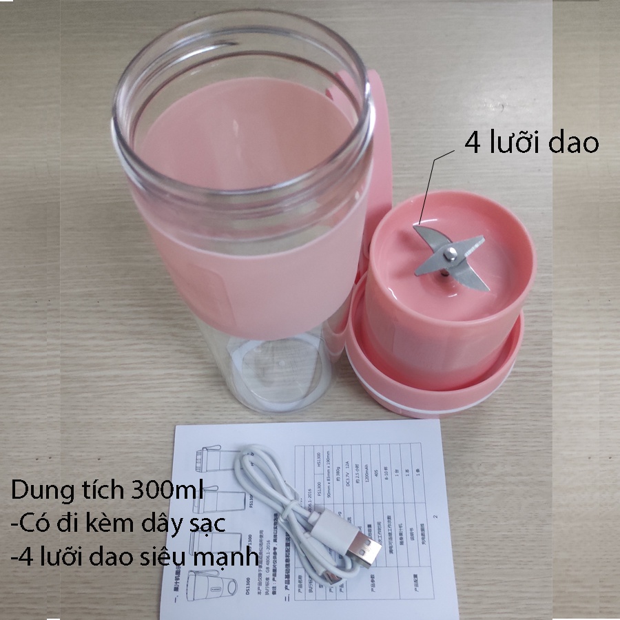 Máy xay sinh tố cầm tay mini đa năng gồm: 1 thân máy, 1 cối xay bình nước mang đi dung tích 300ml có dây sạc: