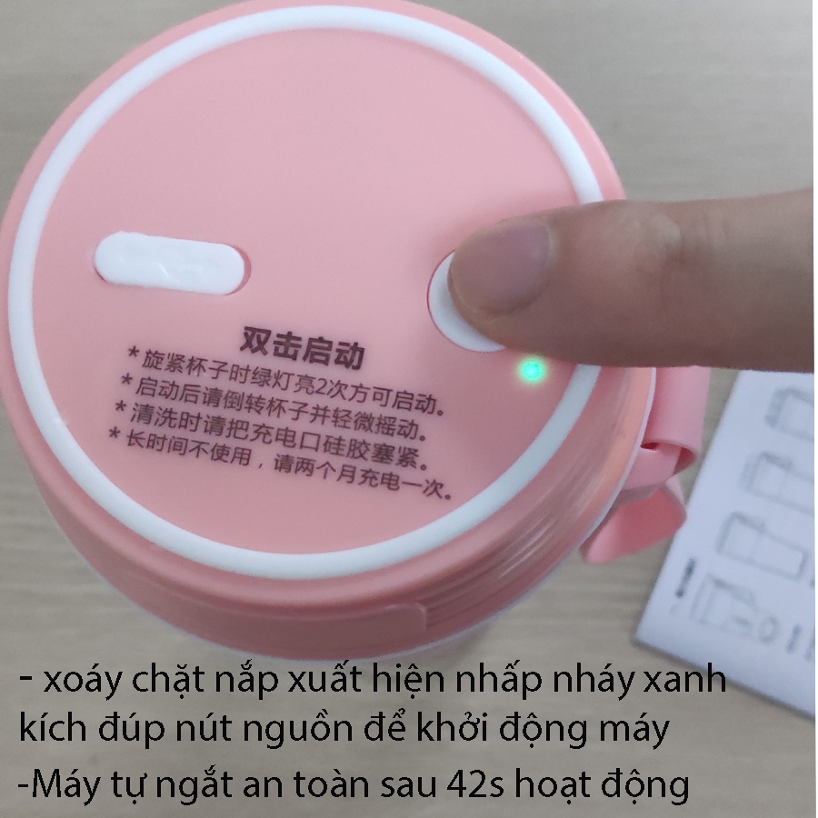 Bước 4: Lật ngược máy và ấn 2 lần liên tiếp vào nút nguồn để khởi động. Trong quá trình xay bạn có thể lắc để hoa quả được xay đều, nhanh hơn. Chỉ cần 30s bạn có thể thưởng thức.Nguyên lý hoạt động thông minh với chu kì 42s máy sẽ tự tắt nên cực kì an toàn và bền.