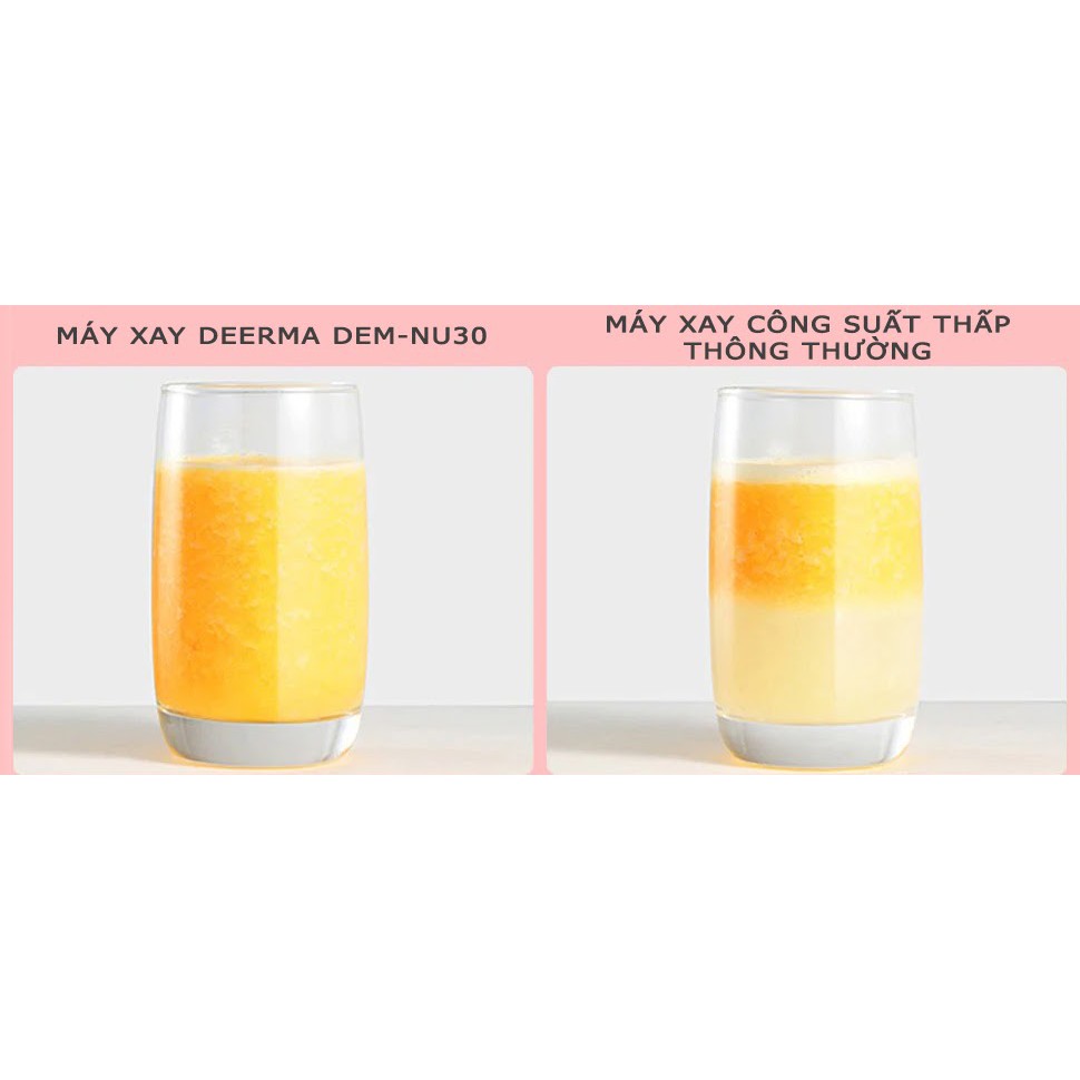Bên cạnh việc sở hữu kích thước nhỏ gọn, dễ dàng mang theo sử dụng trong những chuyến đi du lịch thì máy xay sinh tố cầm tay Deerma DEM-NU30 còn được trang bị động cơ hoạt động với công suất cao giúp xay nhuyễn trái cây, rau củ và thực phẩm một cách nhanh chóng nhằm mang đến những ly sinh tố thơm ngon, sánh mịn, đáp ứng mọi nhu cầu thưởng thức đồ uống khác nhau của người dùng. Ngoài việc tạo ra ly sinh tố, máy còn có thể sử dụng để làm thức ăn dặm vô cùng dinh dưỡng cho các bé.