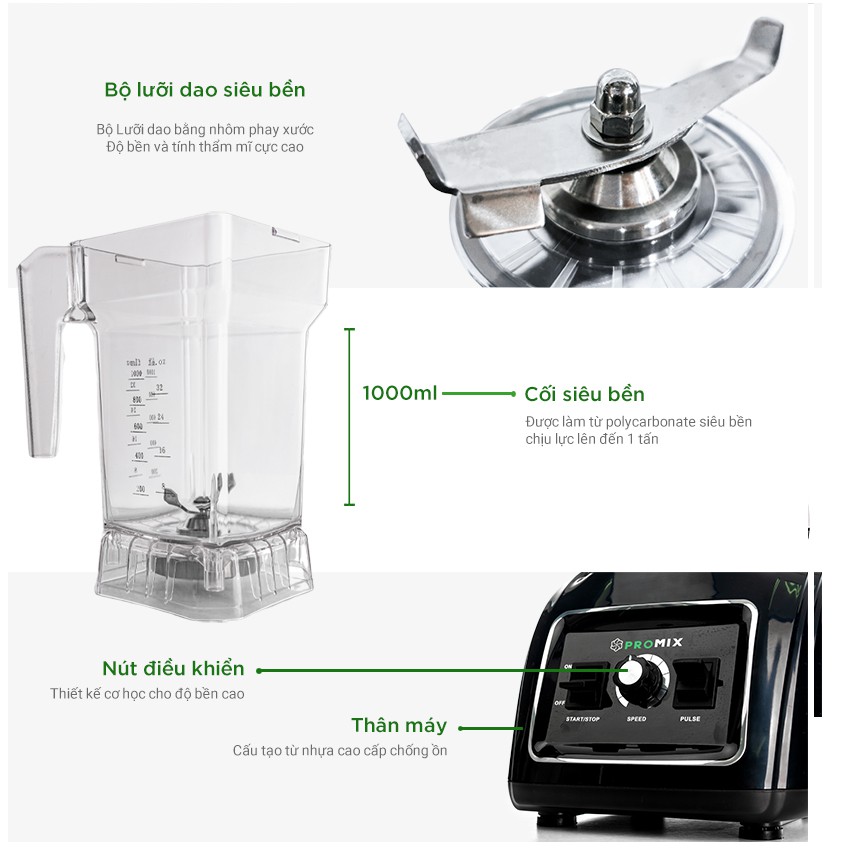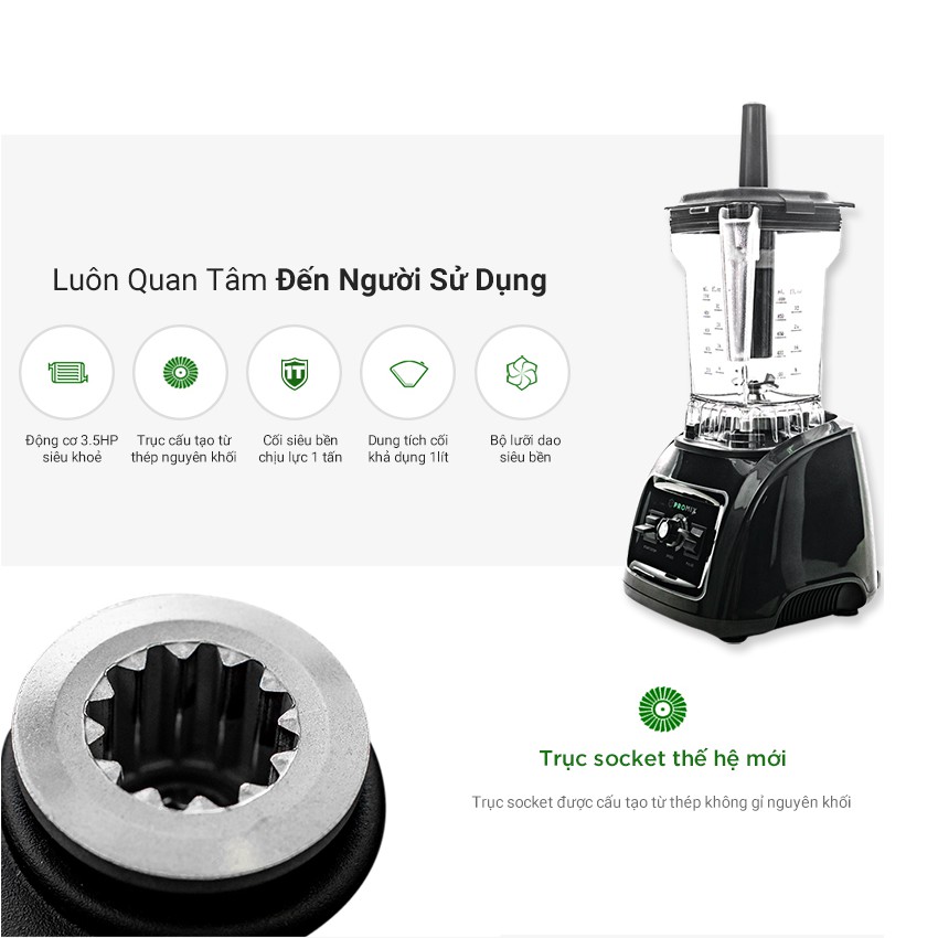 Máy xay Promix có công suất xay lên tới 1300W đảm bảo công suất xay mỗi ngày hơn 100 lần. Sự kết hợp giữa lưỡi dao thép không gỉ dày và cùn, công suất mạnh mẽ có thể điều chỉnh tốc độ quay lưỡi dao và bảng điều khiển đơn giản dễ sử dụng chính là điểm mấu chốt mang lại giá trị cho Promix.