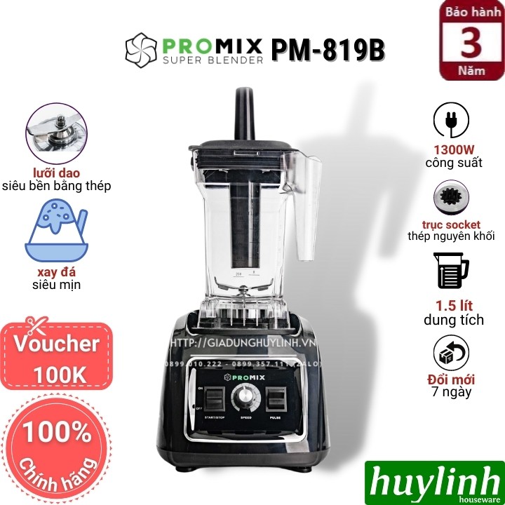 Máy xay sinh tố Promix PM-819B là dòng máy xay công nghiệp với khả năng xay đá cực tốt với công nghệ lưỡi dao hiện đại hút thực phẩm xuống lưỡi để xay.Huy Linh phân phối và bảo hành chính hãng tại Promix Việt Nam.