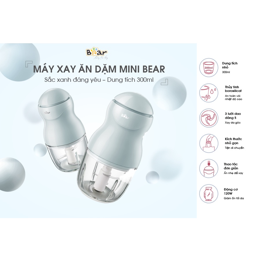 Máy xay đa năng Bear được thiết kế đơn giản với một nút điều khiển duy nhất cực dễ sử dụng, Thiết kế đơn giản với cốc xay và lưỡi dao tháo rời, dễ vệ sinh, thanh thế phụ kiện khi cần thiết. Phù hợp cho các mẹ sử dụng xay đồ ăn dặm cho bé cũng như làm các món xay cho cả gia đình.Máy xay Bear có lưỡi dao sắc bén có thể xay nhuyễn các loại thịt, tôm, cá, rau củ quả... Ngoài ra các mẹ có thể xay sinh tố, sữa chua, hoa quả cho bé. Máy xay cực êm, đế cao su chống trơn trượt.