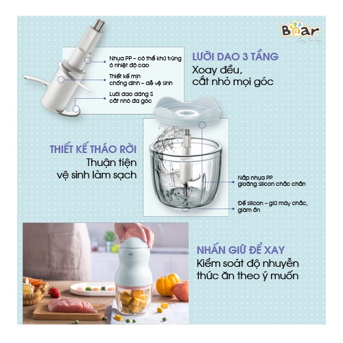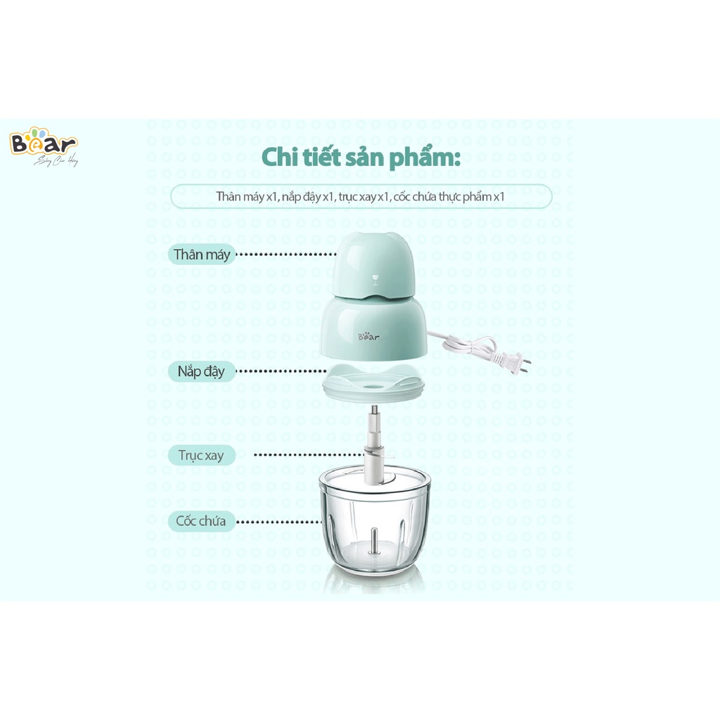 Máy xay đa năng Bear được thiết kế đơn giản với một nút điều khiển duy nhất cực dễ sử dụng, Thiết kế đơn giản với cốc xay và lưỡi dao tháo rời, dễ vệ sinh, thanh thế phụ kiện khi cần thiết. Phù hợp cho các mẹ sử dụng xay đồ ăn dặm cho bé cũng như làm các món xay cho cả gia đình.Máy xay Bear có lưỡi dao sắc bén có thể xay nhuyễn các loại thịt, tôm, cá, rau củ quả... Ngoài ra các mẹ có thể xay sinh tố, sữa chua, hoa quả cho bé. Máy xay cực êm, đế cao su chống trơn trượt.