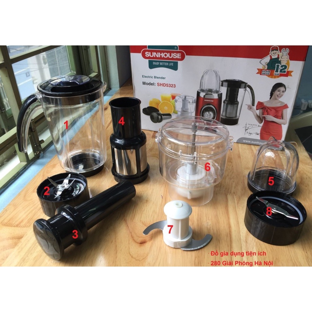 - Máy xay sinh tố Sunhouse SHD 5323 được trang bị cối xay sinh tố kèm lưới lọc bã và 1 thanh đẩy giúp bạn xay trái cây được nhanh hơn. 1 cối xay thực phẩm khô và 1 cối xay thịt, đáp ứng mọi nhu cầu làm bếp của bạn.