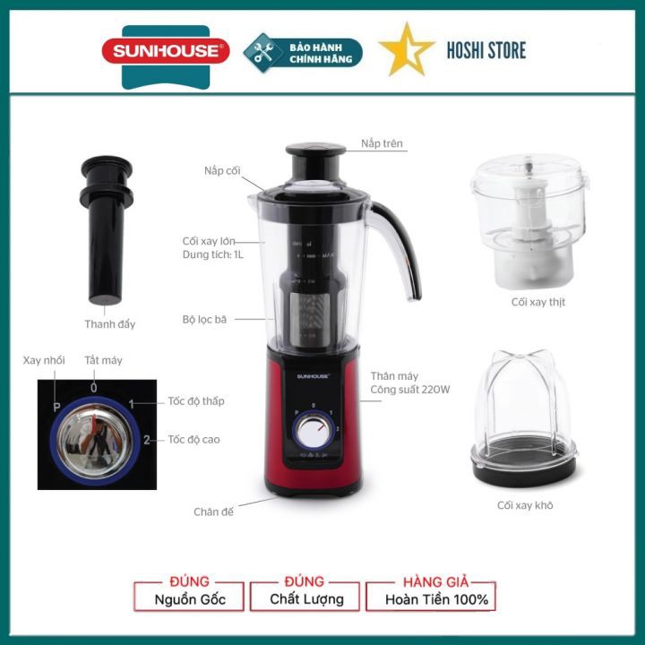 Thiết Bị Điện Gia Dụng > Đồ gia dụng nhà bếp > Máy ép, Xay sinh tố & Máy làm sữa đậu nành || MÁY XAY SINH TỐ ĐA NĂNG SUNHOUSE SHD5322 màu đỏ, 3 cối chức năng xay nhuyễn các loại rau củ quả, thực phẩmCòn hàng