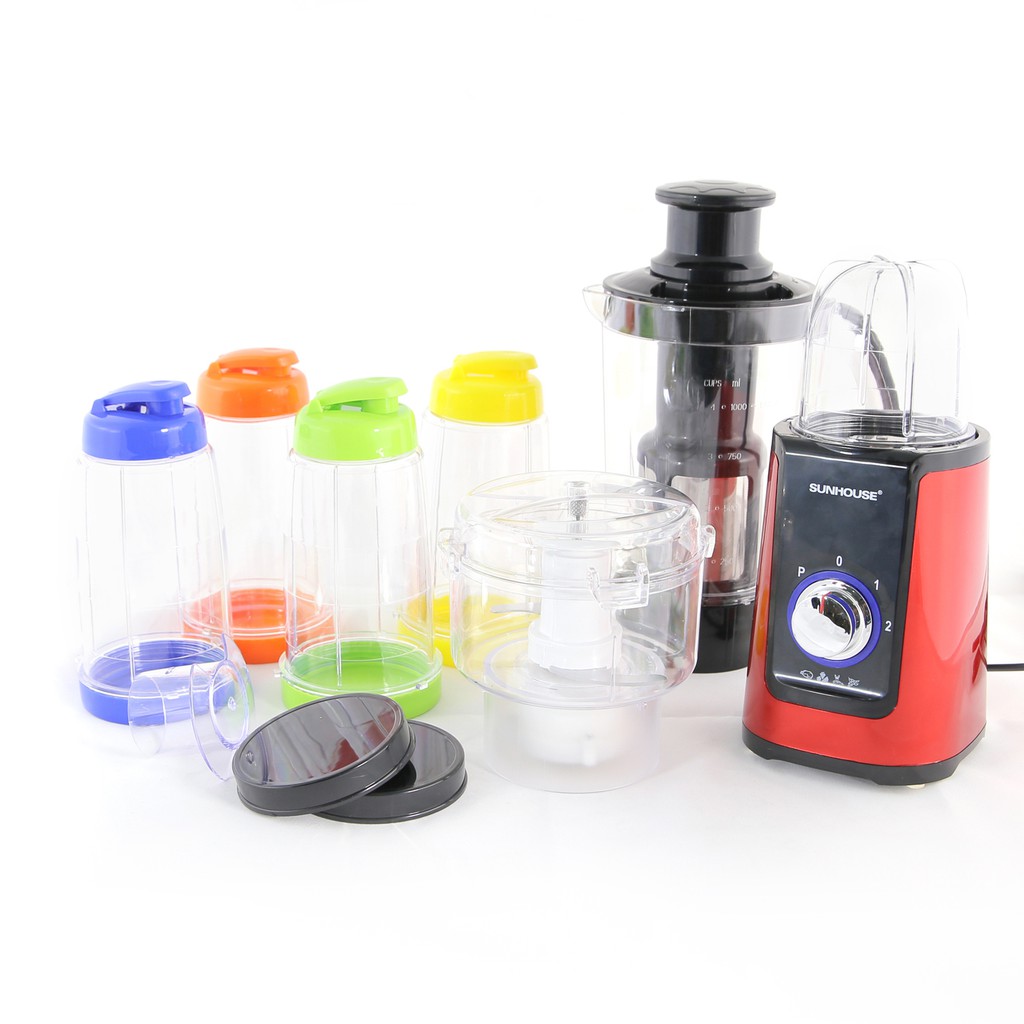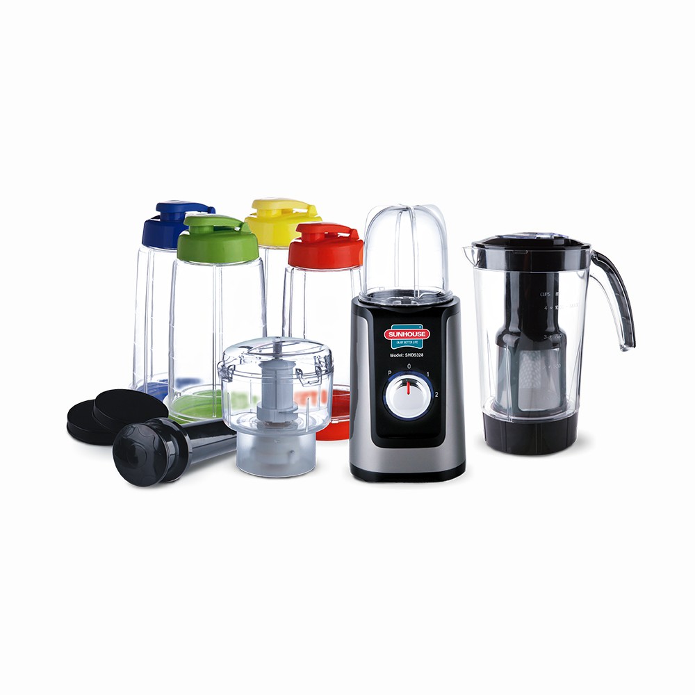 Máy xay sinh tố đa năng SUNHOUSE SHD5328B có thiết kế hiện đại với một cối xay sinh tố kèm lưới lọc bã và 1 thanh đẩy giúp bạn xay trái cây được nhanh hơn, sánh mịn hơn. Bên cạnh đó là 1 cối xay thực phẩm khô và 1 cối xay thịt, 4 bình xay kiêm cốc uống có nắp tiện dụng, đáp ứng mọi nhu cầu làm bếp của bạn.