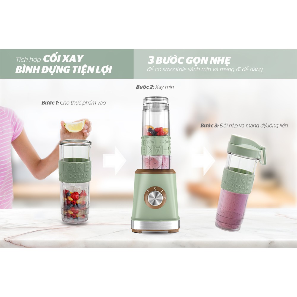 Phụ kiện đi kèm: 1 bình xay kiêm cốc uống có nắp tiện dụng