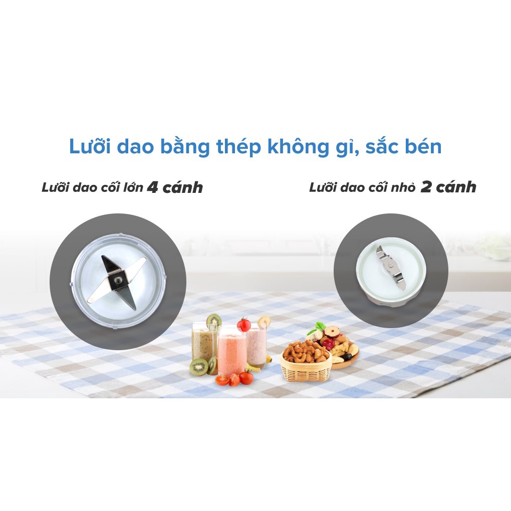 Cối xay lớn dung tích sử dụng 1.25 lít (dung tích tổng 1.5 lít) đáp ứng nhu cầu xay sinh tố tối đa của gia đình. Cối xay nhỏ dung tích sử dụng 200 ml thích hợp dùng xay hạt, tiêu, hành, tỏi…