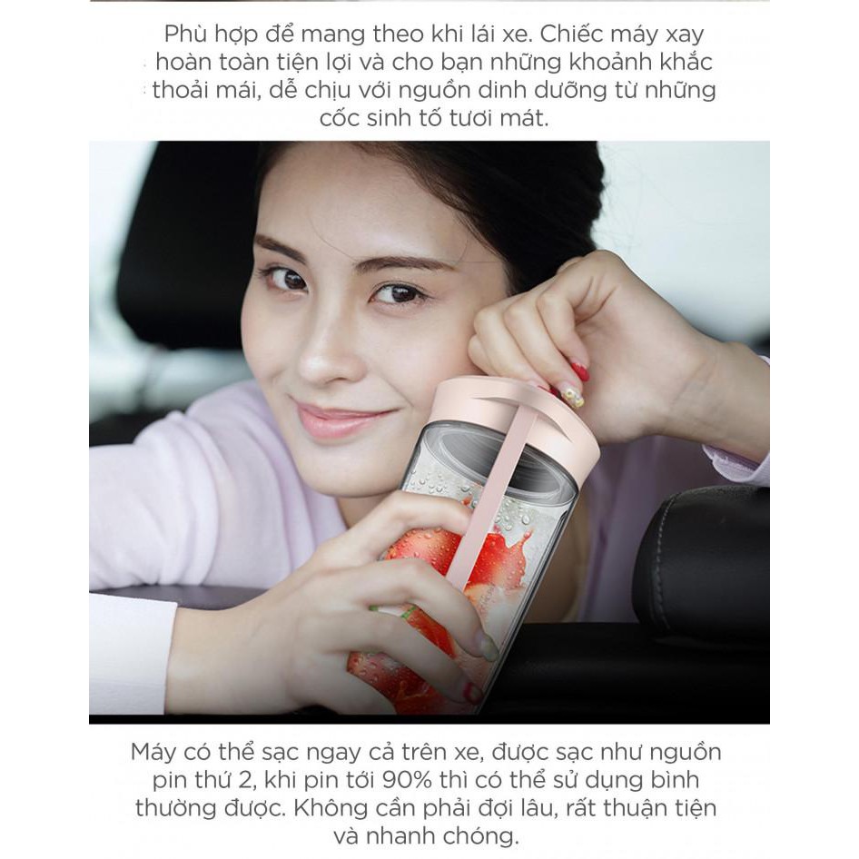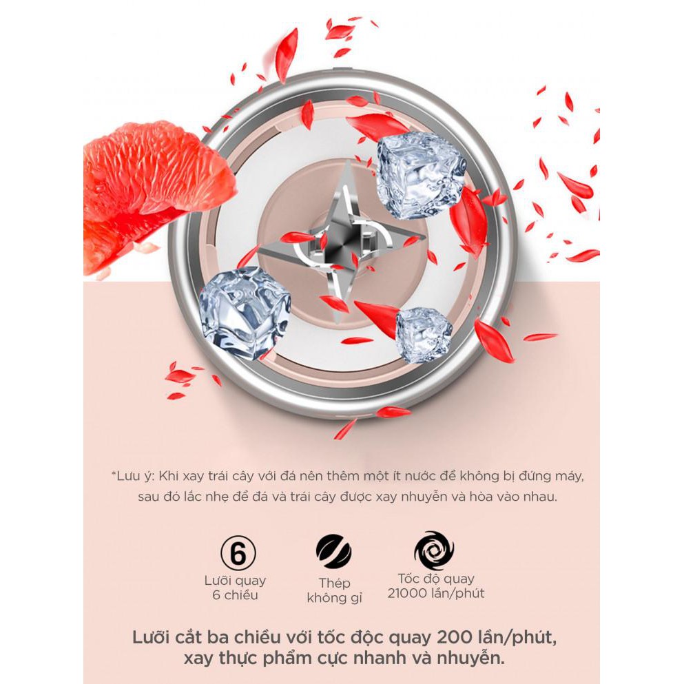 - Pin dung lượng 1500mAh sạc nhanh trong 3 giờ, bạn có thể thực hiện được 6 ly nước ép khác nhau.